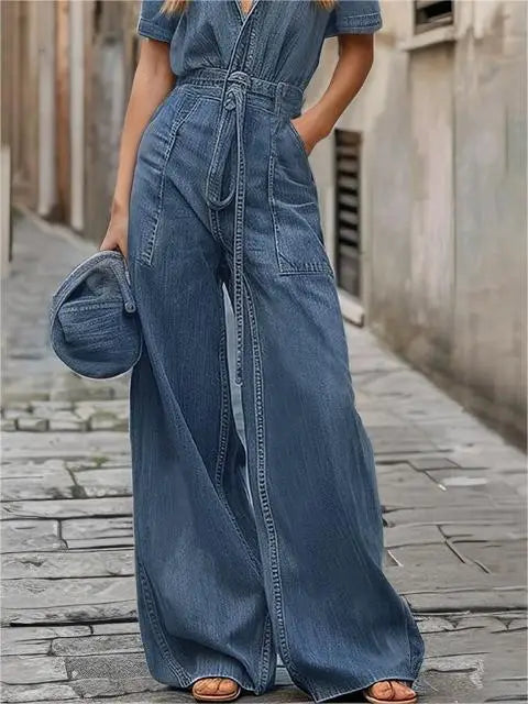 MQTIME - Women's Short Sleeve Blue Jumpsuit Summer Original Creation Button Down Wide Leg Long Pants Rompers with Pockets