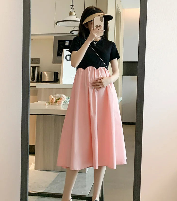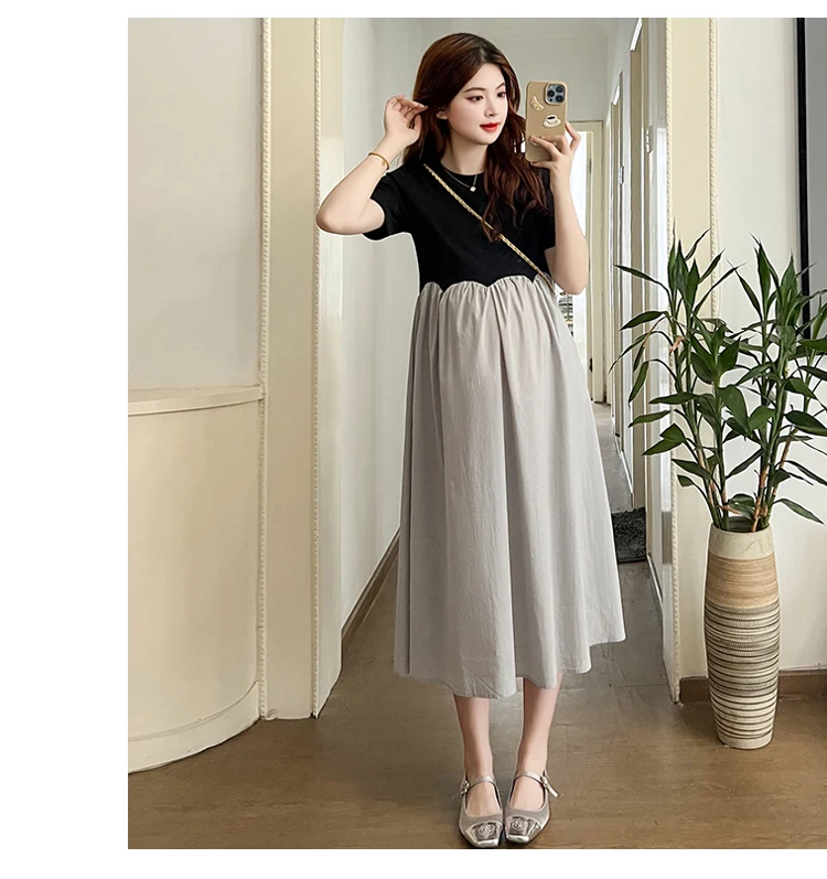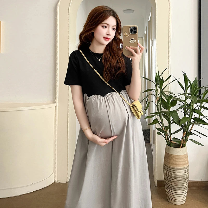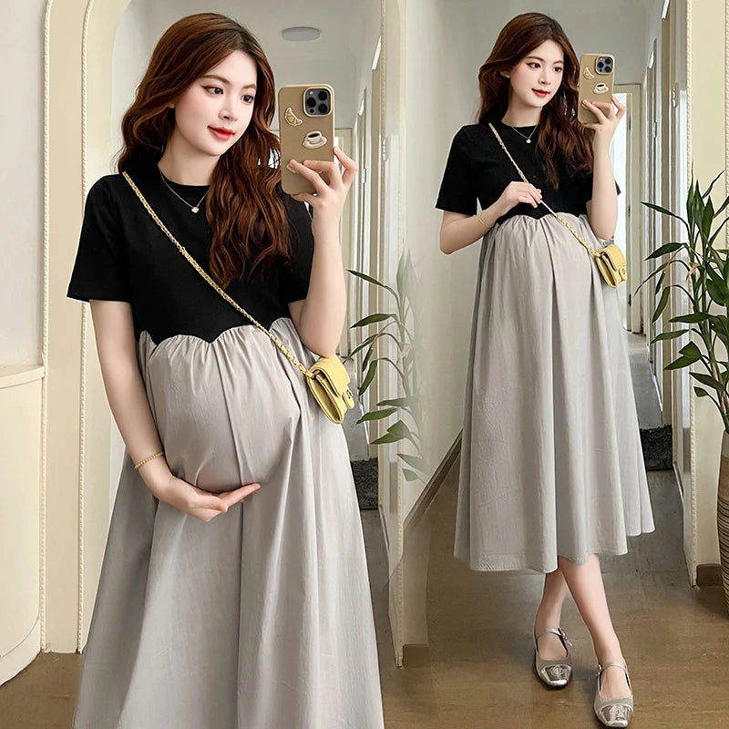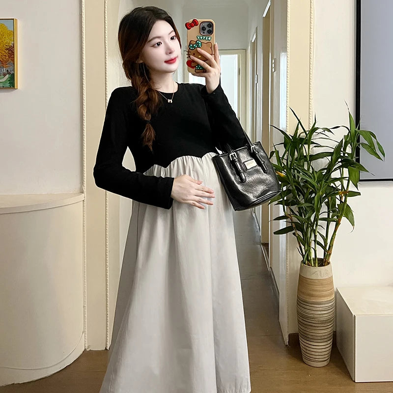 Mqtime 2025 French Style Pregnant Women Elegant Dress Plus Size Long Sleeve O-Neck High Waist Maternity A-Line Dress Long Loose Clothes