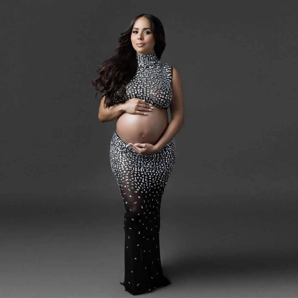 MQTIME - 2Pcs/set Shiny Rhinestone Maternity Dresses For Photo Shoot Sexy Goddess Stretch Fabric Skirt For Pregnancy Photo Accessory