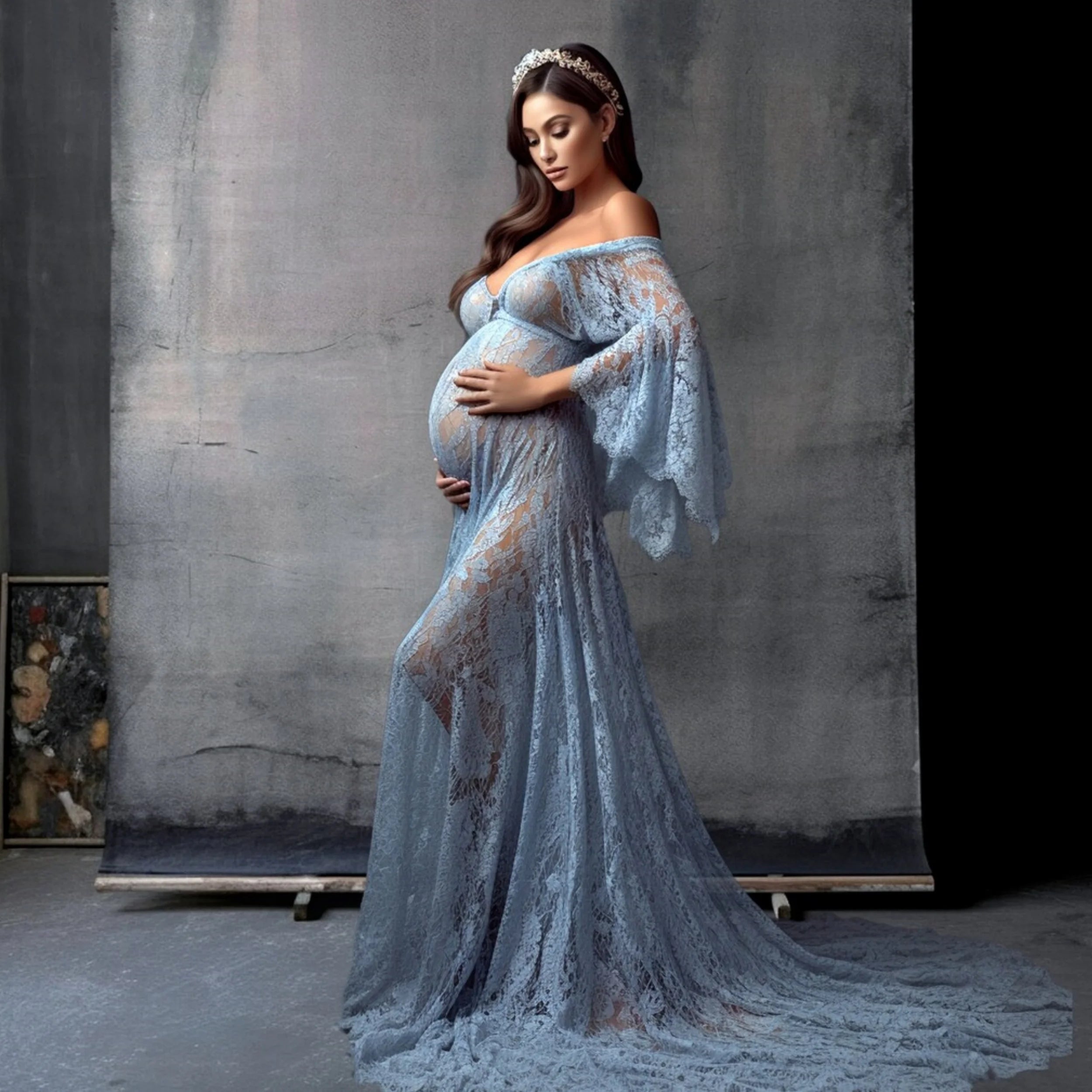 MQTIME - Bohemain Blue Maternity Dresses for Photoshoot Elegant Sweetheart Full Sleeve Babyshower Gowns Lace Photography Customized