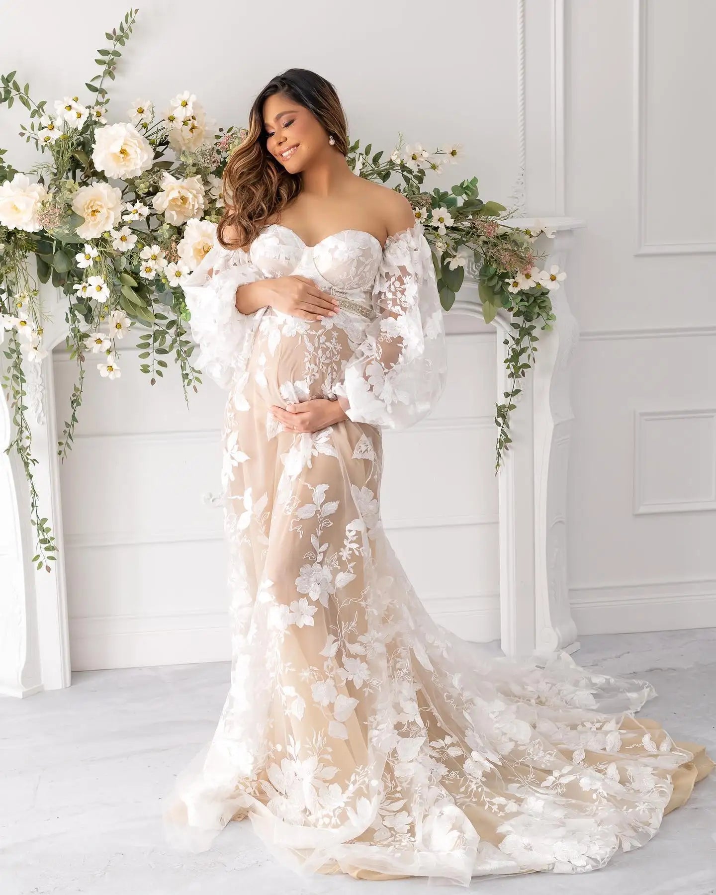 MQTIME - Bohemian Lace Maternity Evening Robes for Photo Shoot Fotos Gowns Long Sleeve Nightgown Baby Shower Dresses for Bride Party
