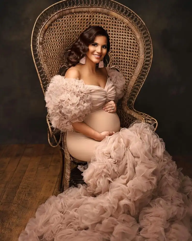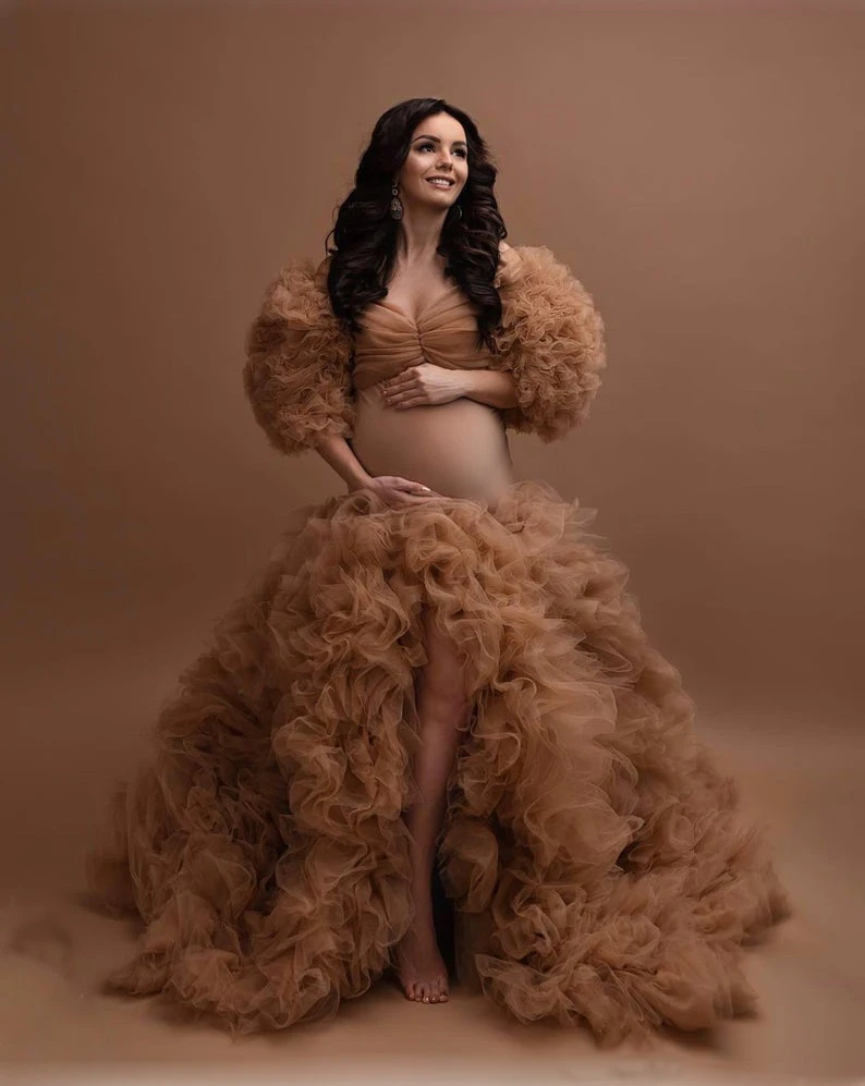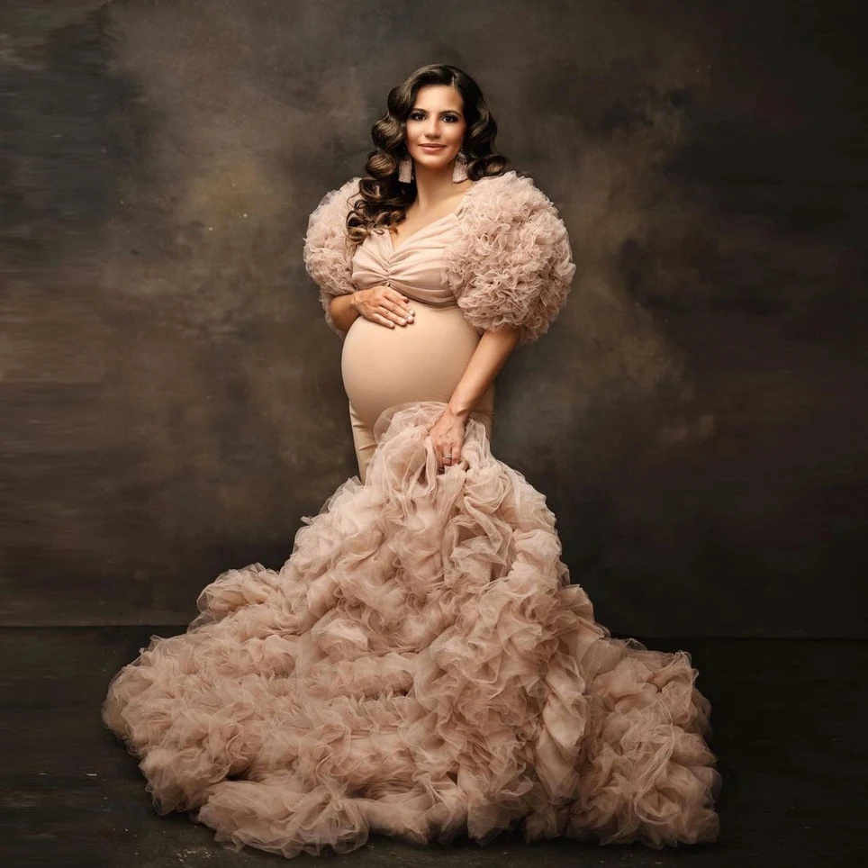 MQTIME - Chic Maternity Tulle Gown Maternity Dress Champagne Tulle Maternity Dresses for Photo Shoot Robe Pregnant Women Formal Gowns