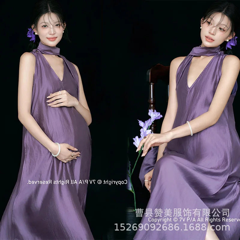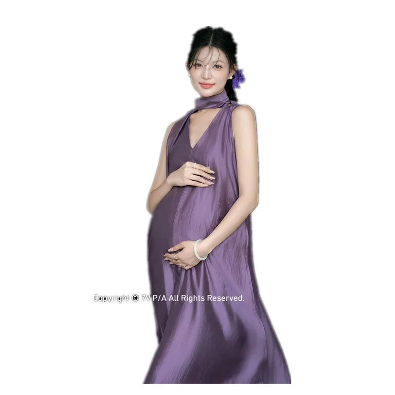 MQTIME - Elegant Maternity Photo Shoot Dress – Stylish Purple V-Neck Sleeveless Dress for Pregnant Women Studio Photography Clothing