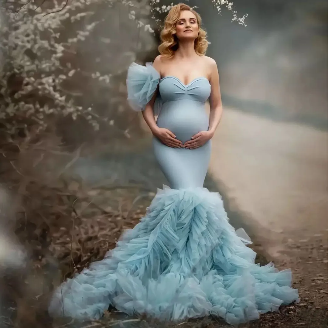 MQTIME - Elegant Mermaid Maternity Photography Dresses for Pregnant Woman Ruffled Tulle Chic Sleeves Maternity Dress Photoshoot Custom