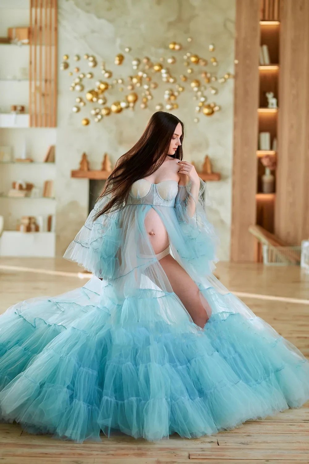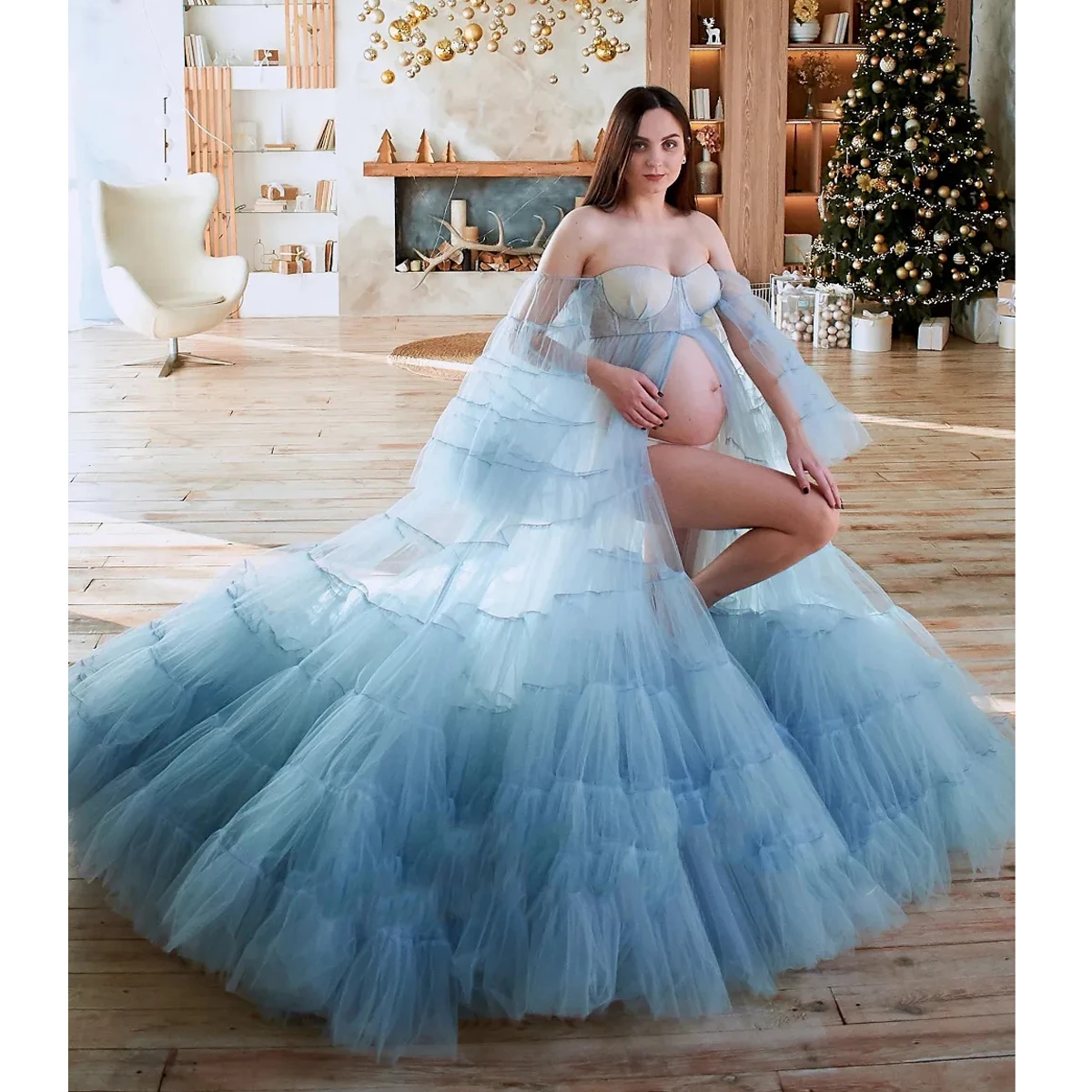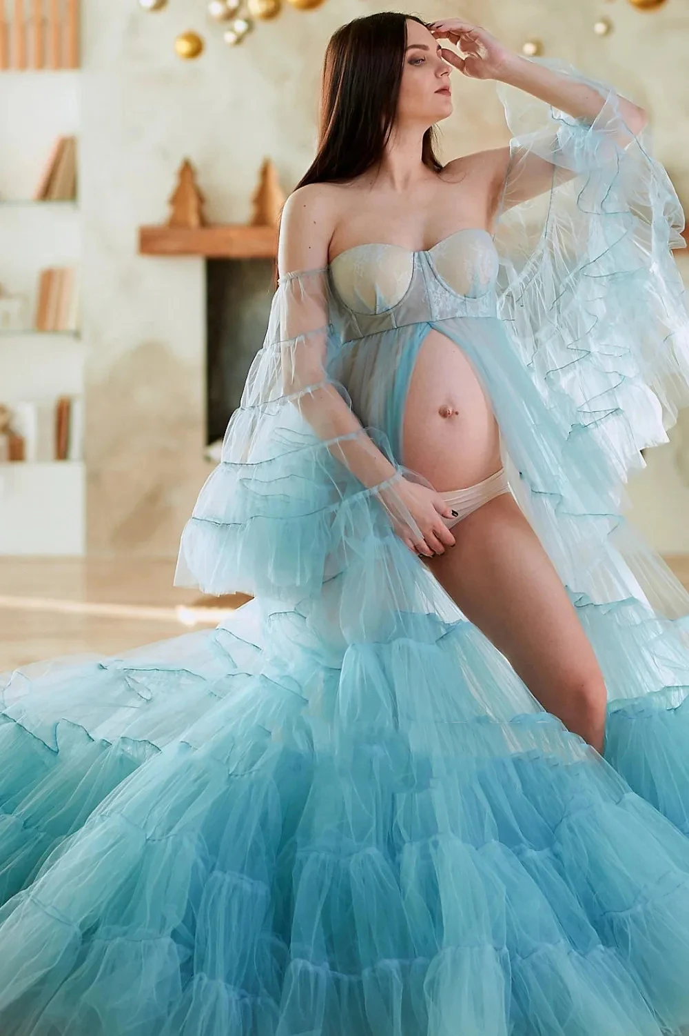MQTIME - Fairy Blue Maternity Dresses Photoshoot Fluffy Tulle Puff Sleeves Elegant Maternity Dress for Pregnant Woman Babyshower Gowns