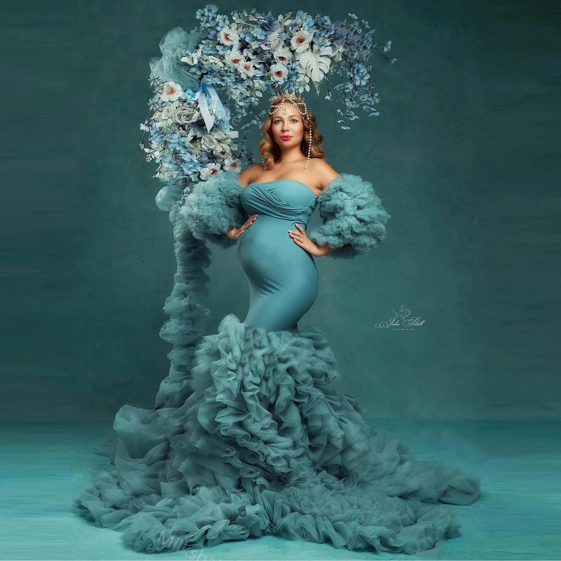 MQTIME - Fashion Photo-shoot Maternity Dresses with Sleeves Mermaid Pregnancy Dress Blue Stretchy Long Party Prom Gowns Tierred