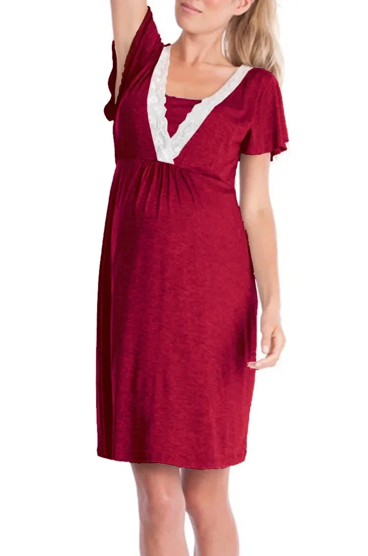 Fashion Multifunction Womens Mother Lace Pregnants Pajamas Short Sleeve Nursing Pregnant Pajamas Solid Color Dress Cozy