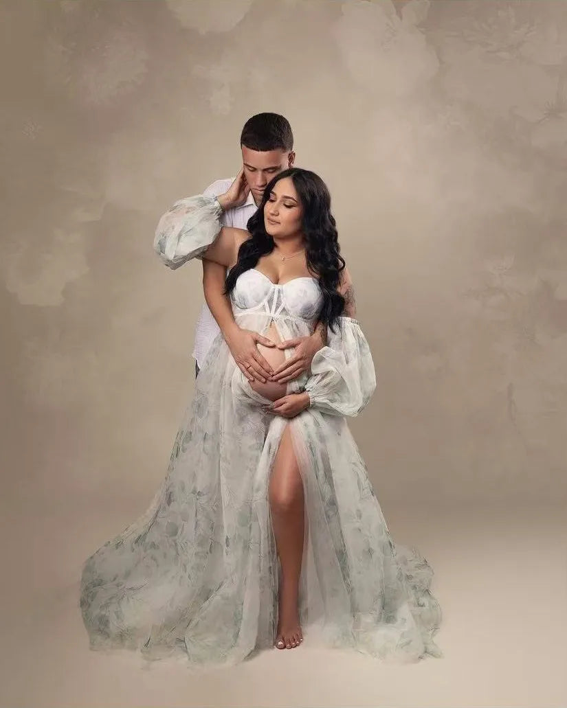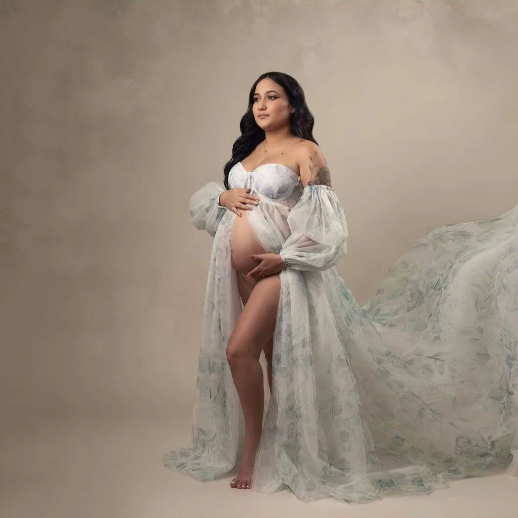 MQTIME - Floral Bridal Maternity Dresses With Sleeve Sexy Slit Puffy Custom Made Women Flower Pattern A Line Party Dresses Pregnant Gown