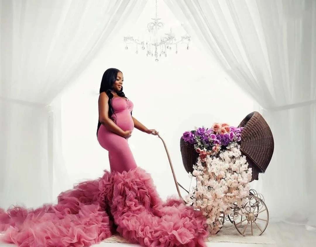 MQTIME - Gorgeous Pink Mermaid Maternity Gown Photography Dresses Strapless Puffy Ruffled Tulle Pregnancy Maternity Dress Stretchy Custom