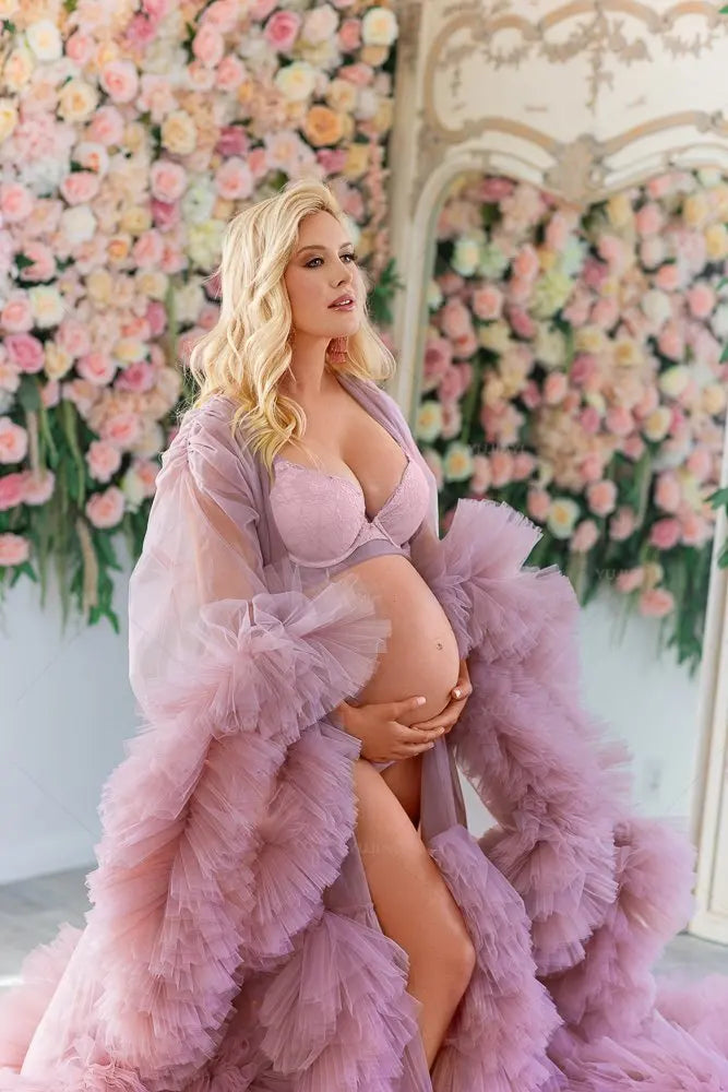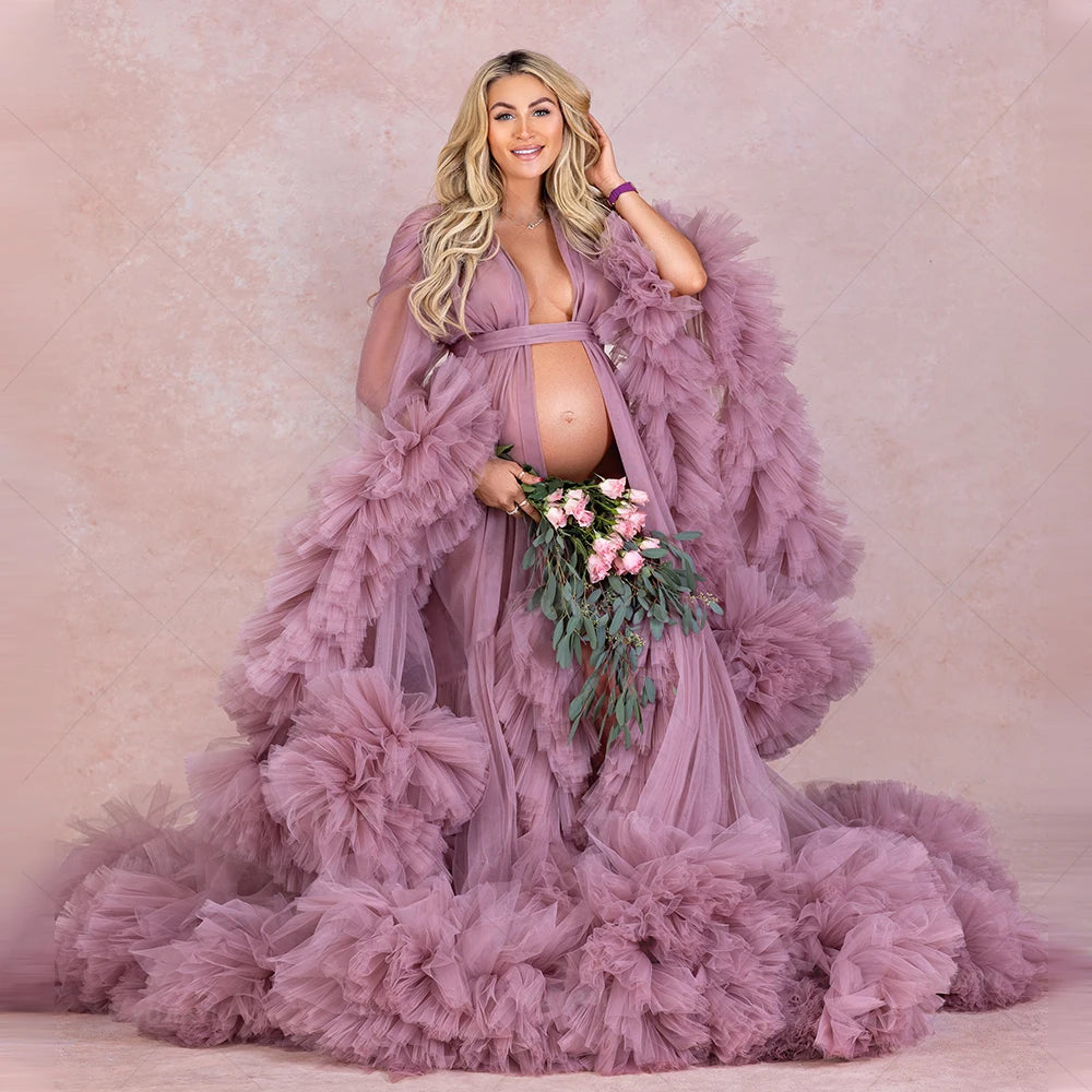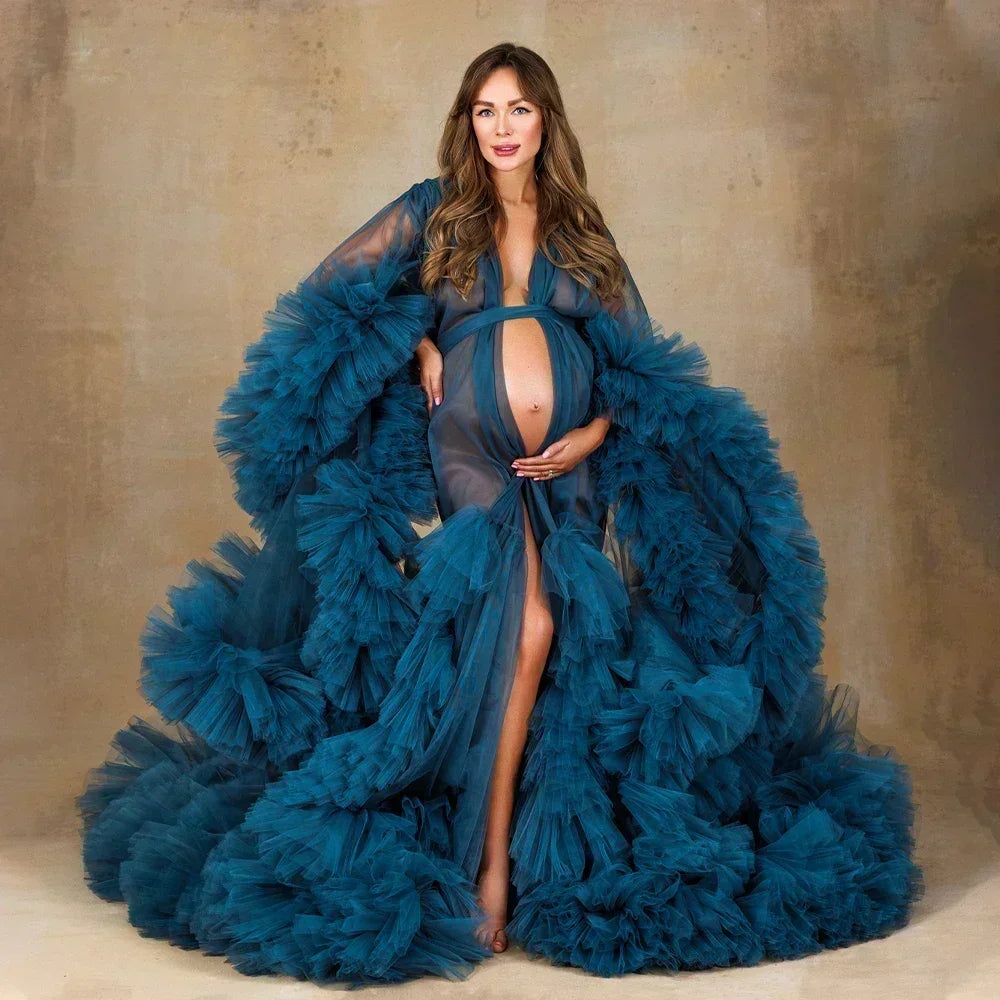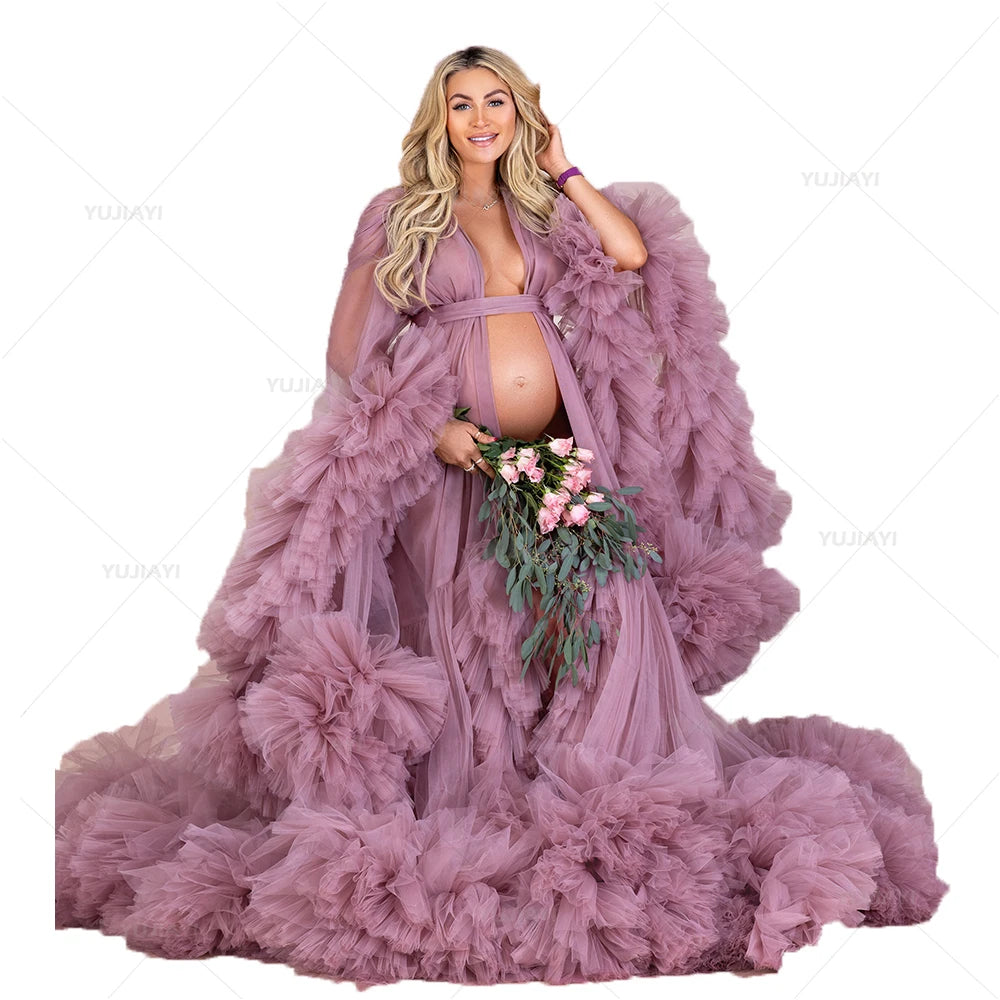 MQTIME - Luxury Customized Maternity Dresses for Photoshoot Tulle Robe Wedding Bridal Sleepwear Nightwear Front Split BabyShower Gown