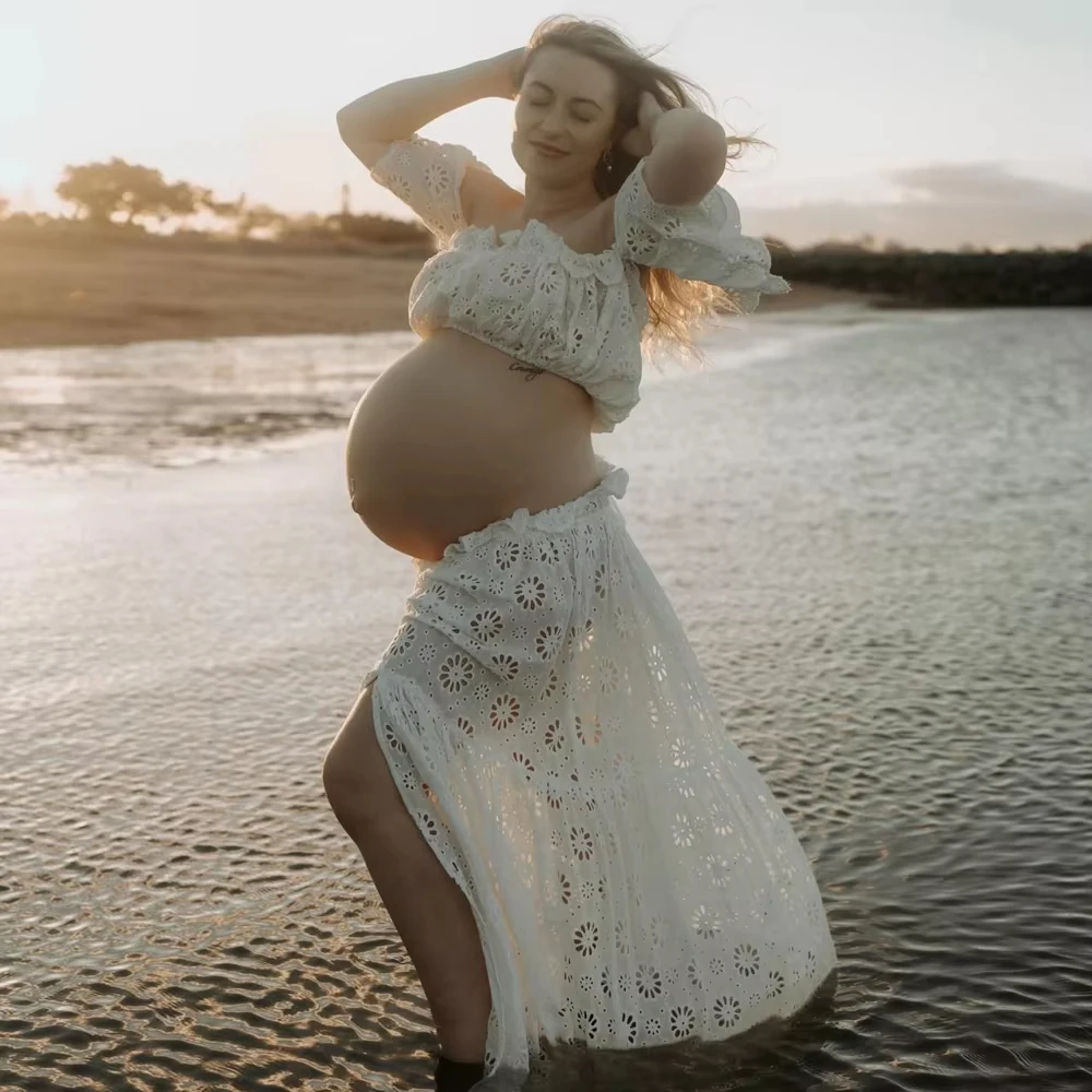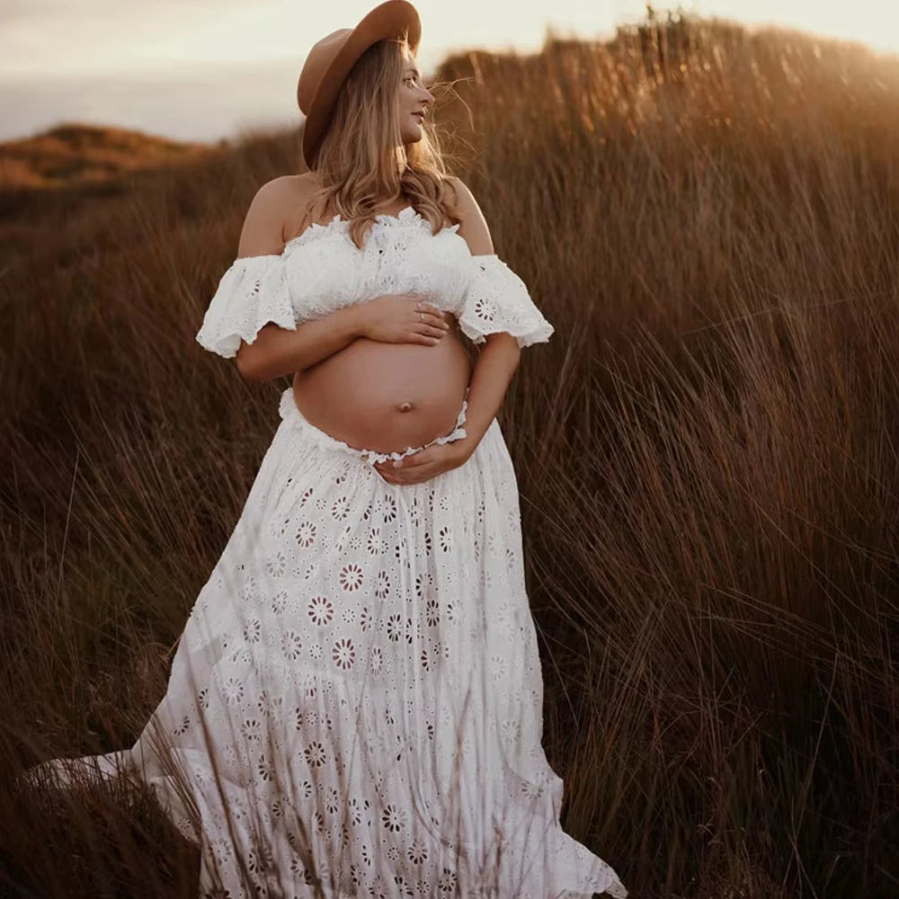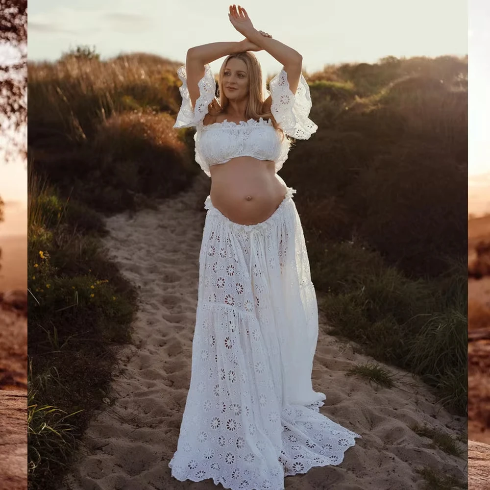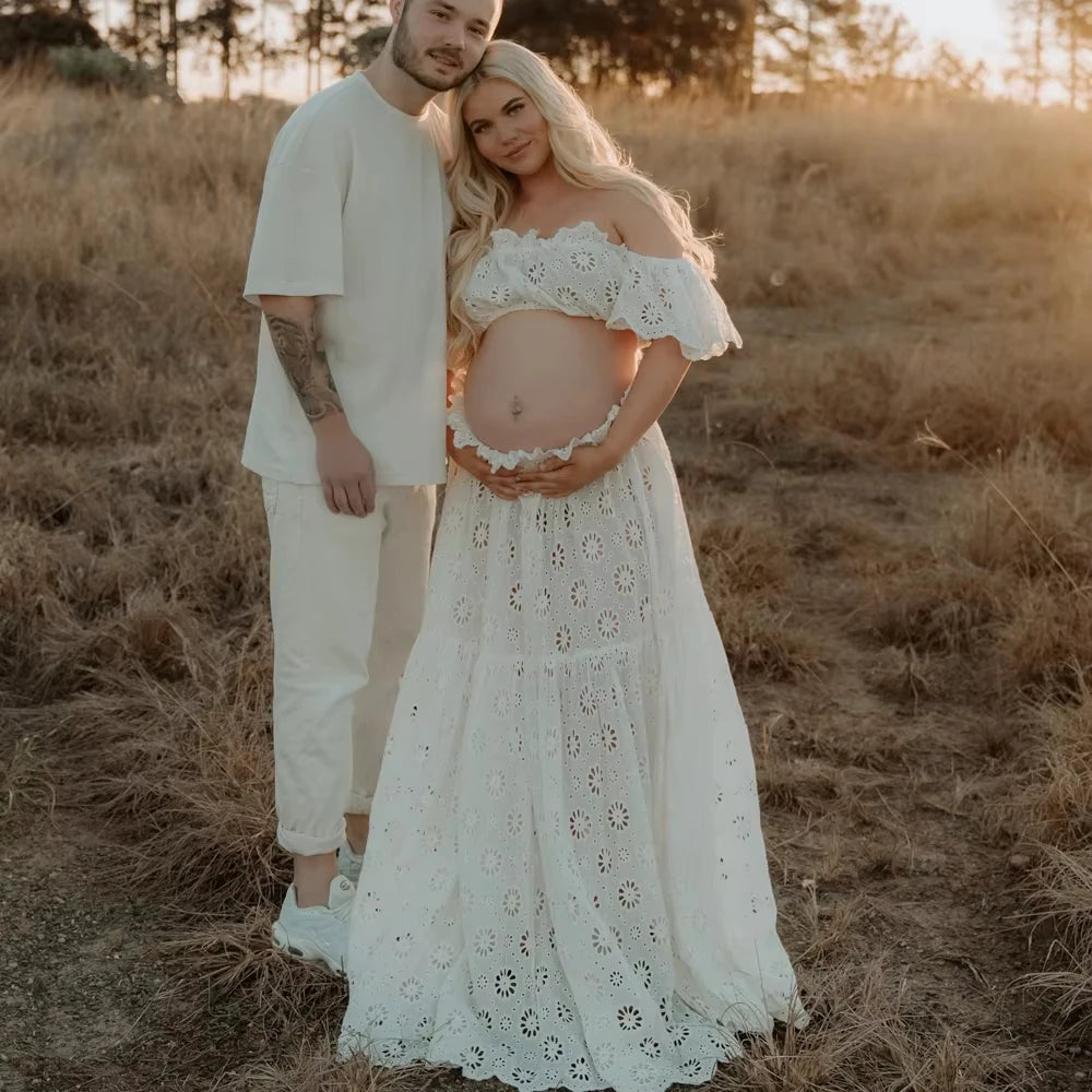 MQTIME  -    Maternity Dress Photoshoot Hollow Lace Elegant Pregnancy Gown for Baby Shower Pregnancy Photos Elastic Waist Two-Piece