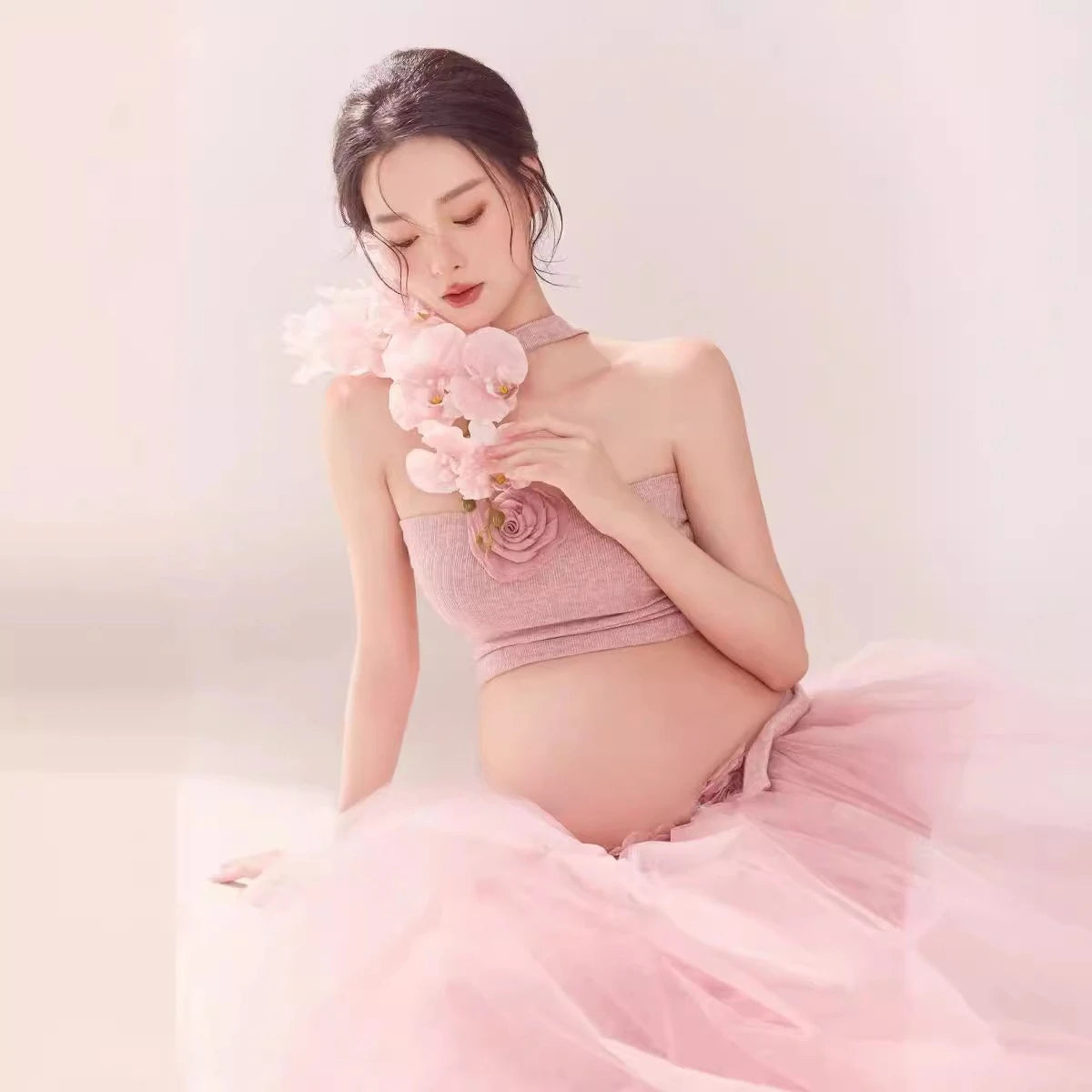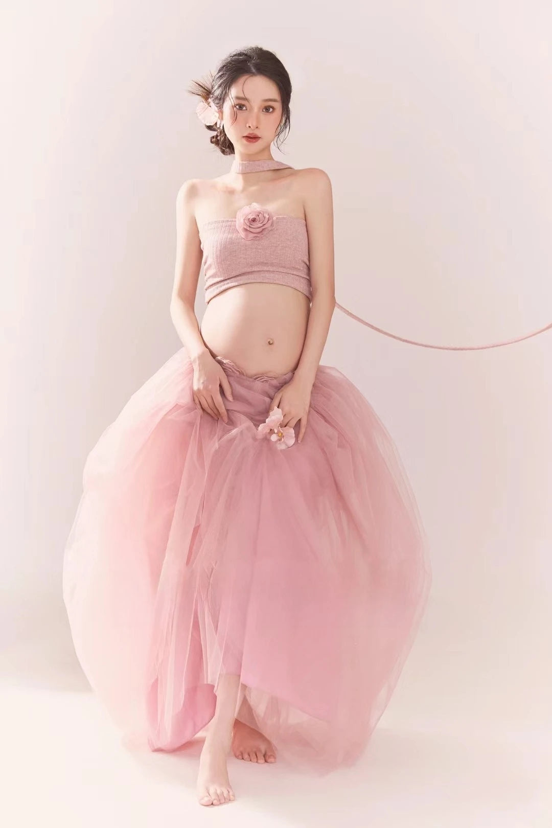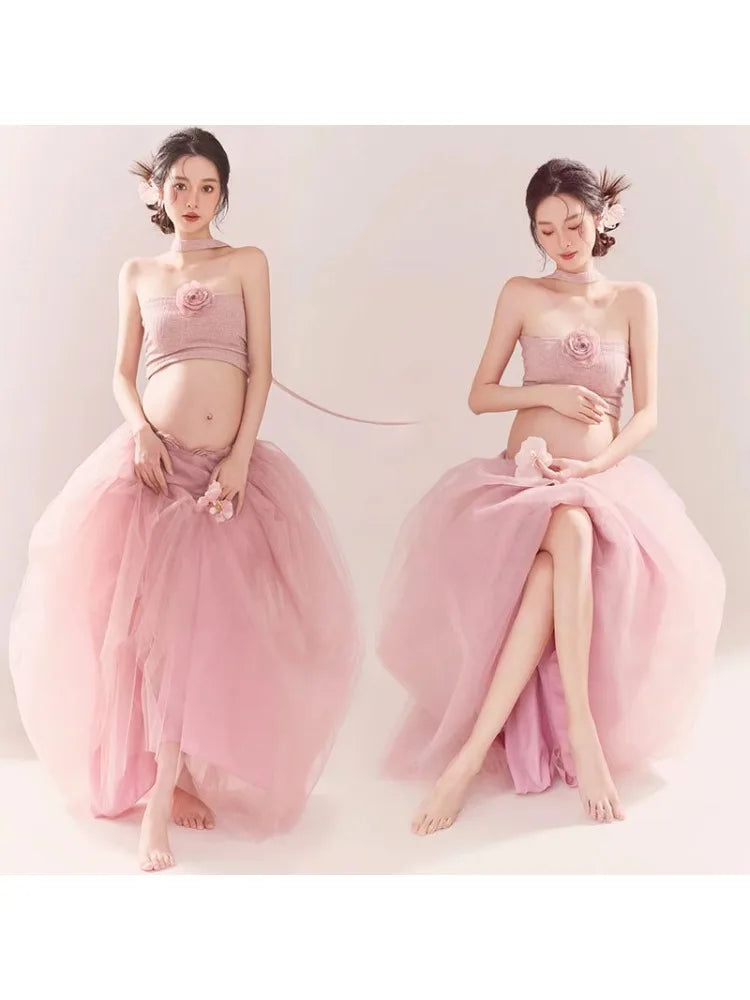 MQTIME - Maternity Photo Shoot Outfit Pink Sweet Tupe Top with Mesh Tutu Long Skirt 2pcs for Pregnant Women Studio Photography Shooting