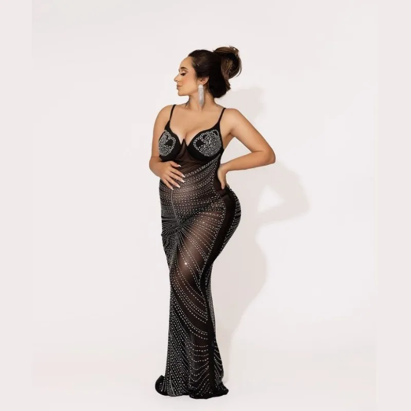 Mqtime Maternity Photography Dress Baby Shower Gown Sexy Sleeveless Shiny Rhinestone Goddess Bodysuit Pregnant Woman Photo Shoot Props