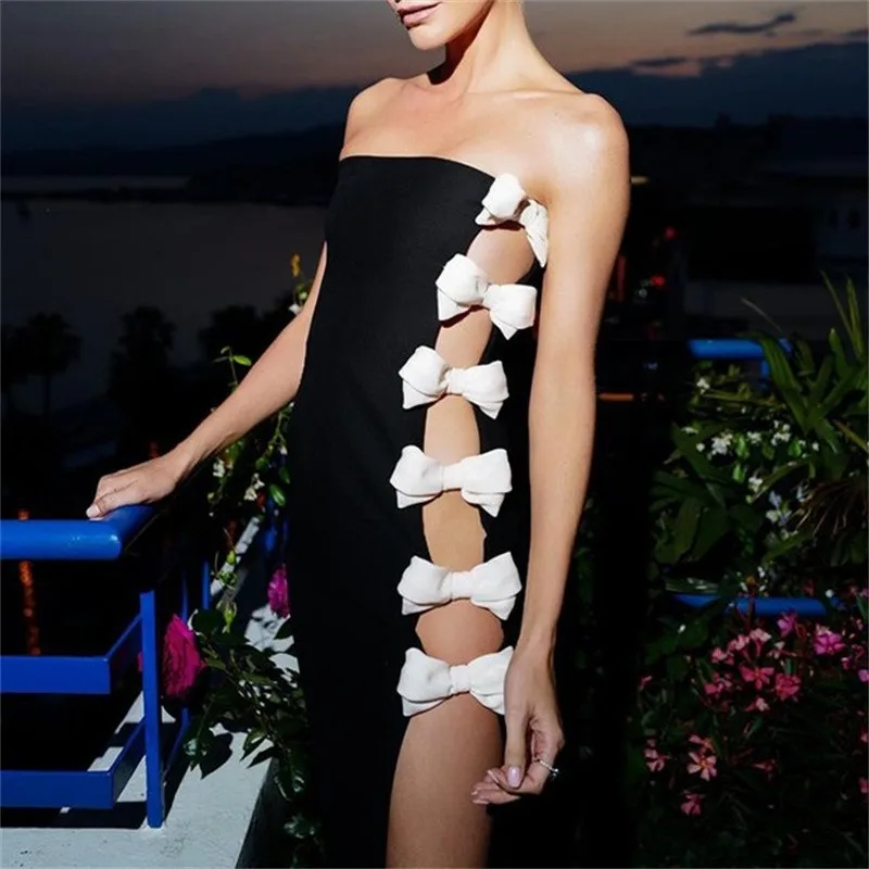 MQTIME - Maternity Photography Dresses Baby Shower Dress Hollow Out Dress Elegant Bow Tie One-neck Dress Studio Photo Shoot Props