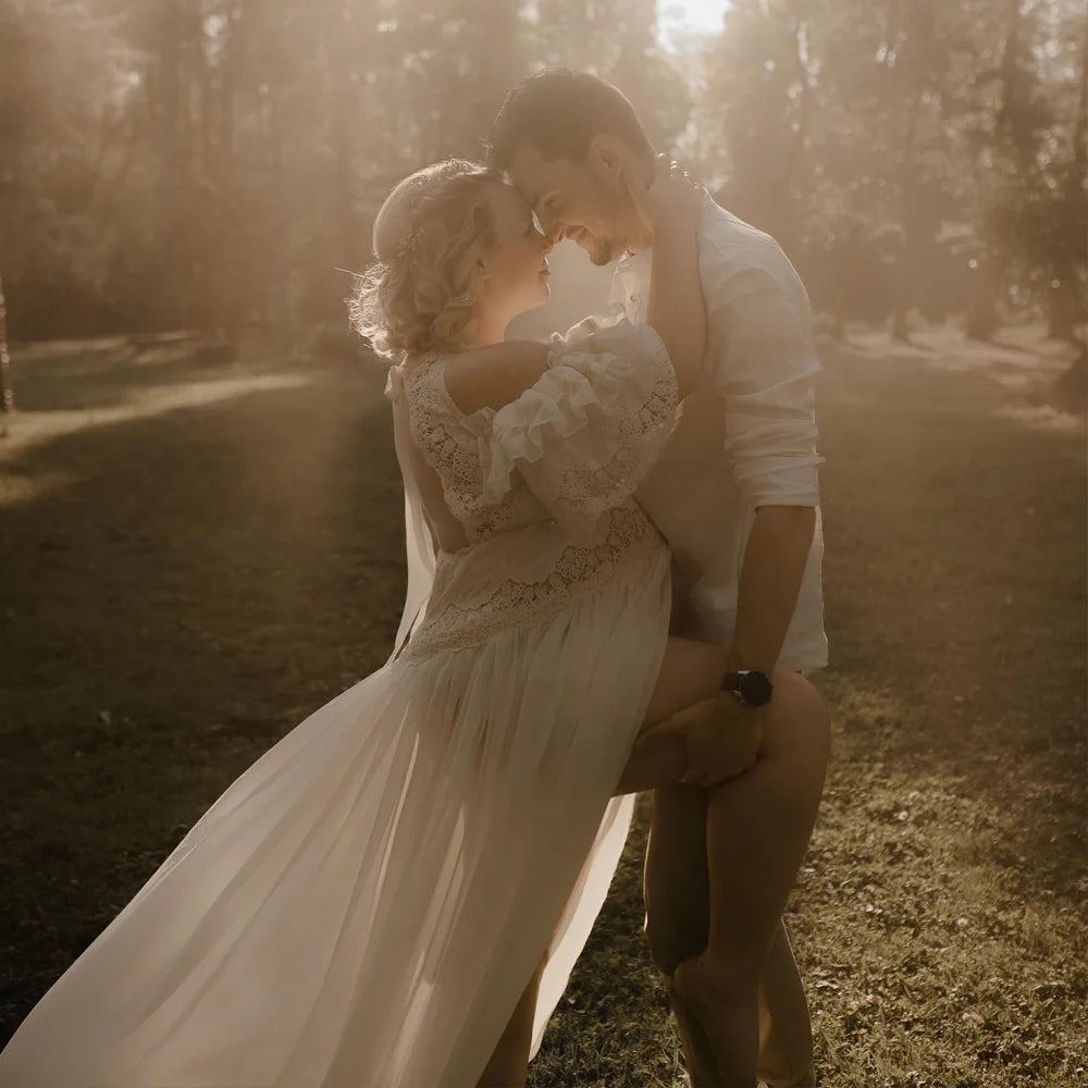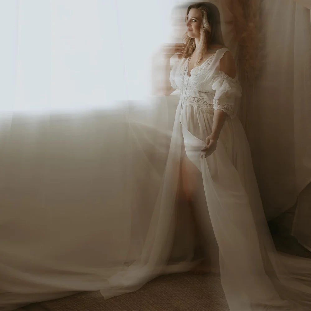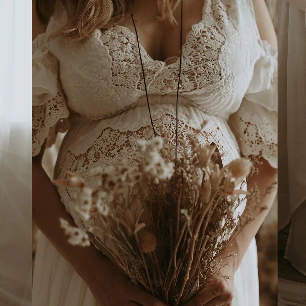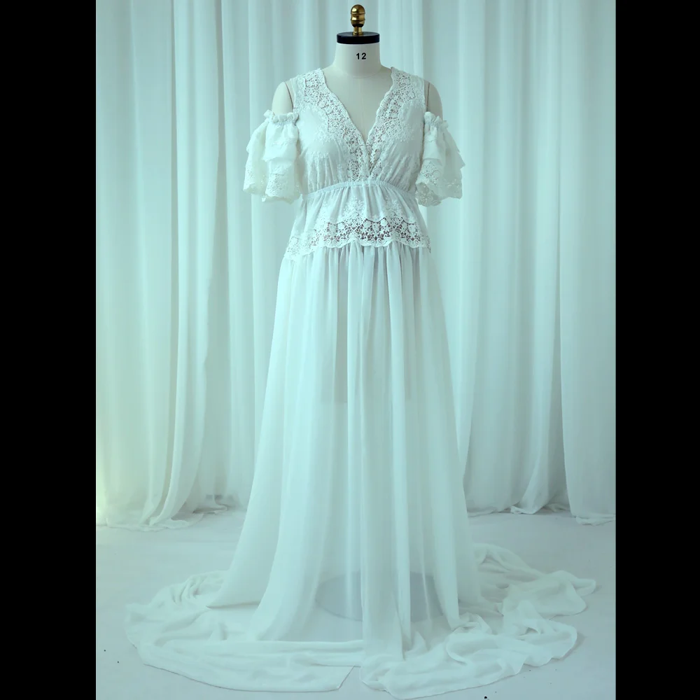 MQTIME - Maternity Photography Props Dress V-neck Embroidered Cotton Lace&Chiffon Dress Photo Shoot Photography Dress For Women