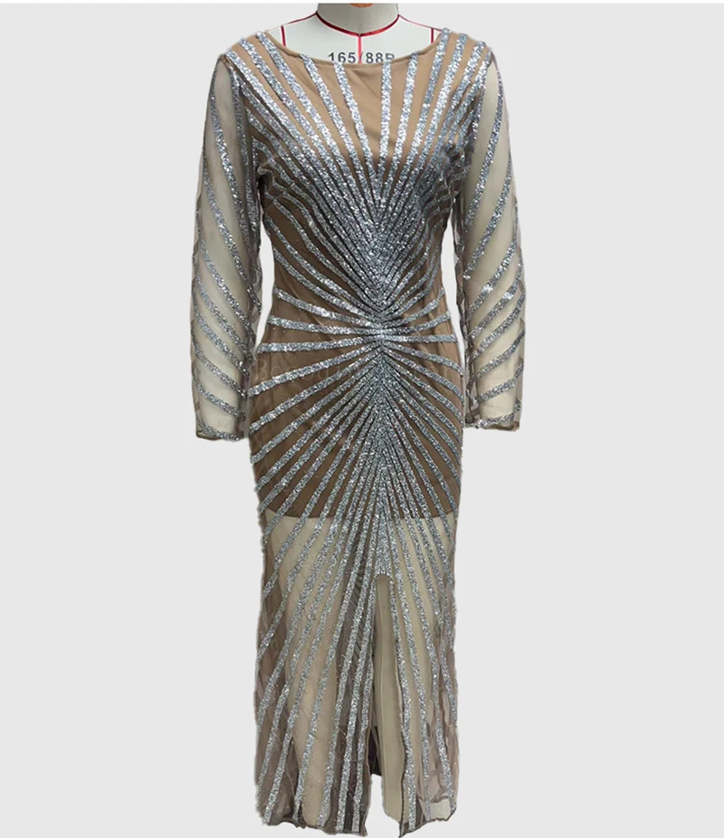 MQTIME - Maternity Photoshoot Dress for Baby Shower Women Sexy Long Sleeve Rhinestone Sheer Mesh Maxi Dress with Side Slit Formal Shoot