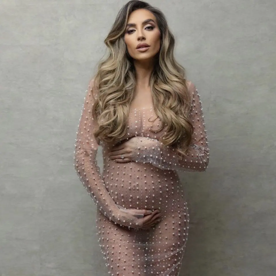 MQTIME - Mesh See Through Maternity Photography Long Dresses Pearl Transparent Tulle Pregnancy Photo Shoot Dress For Women Gown Party