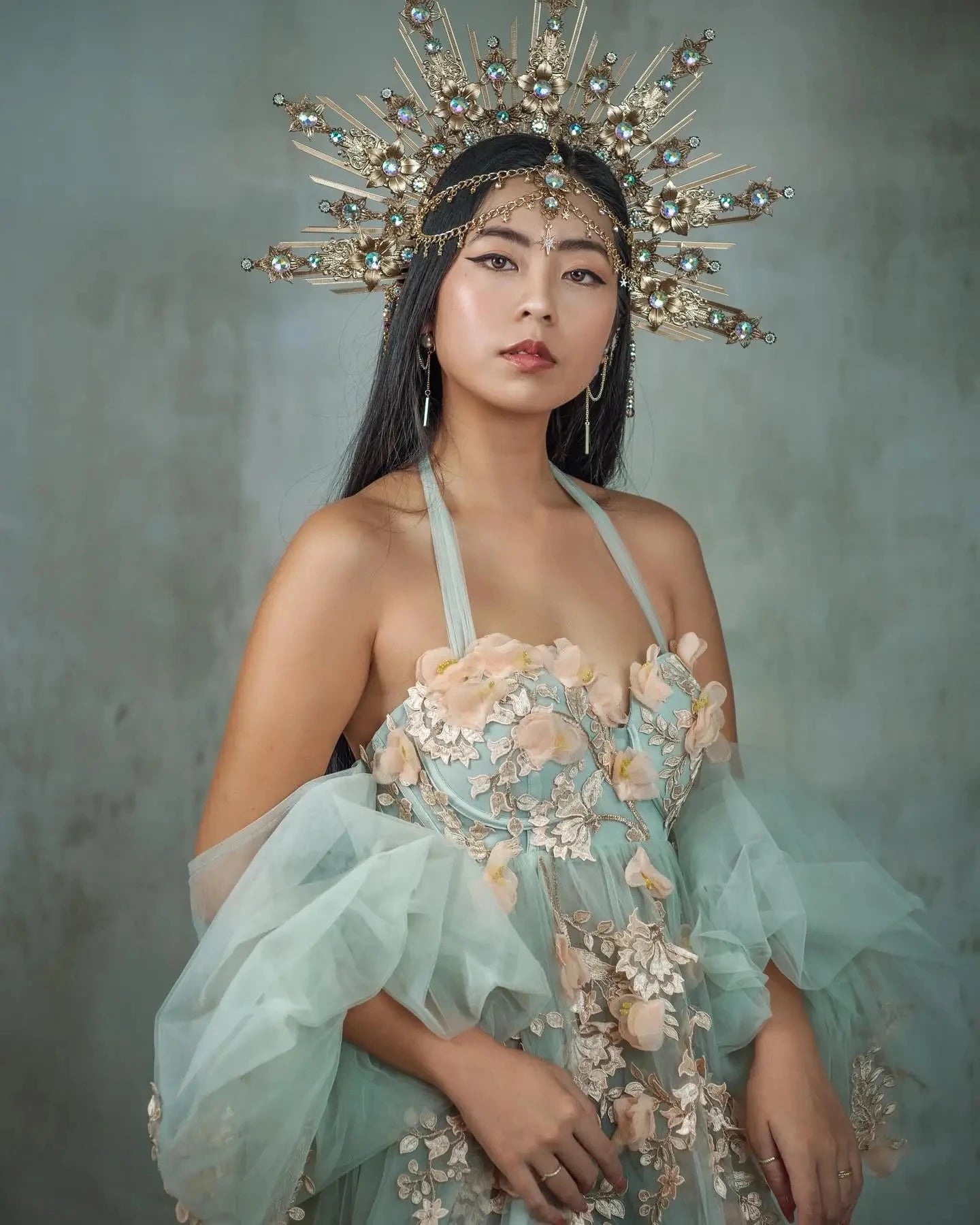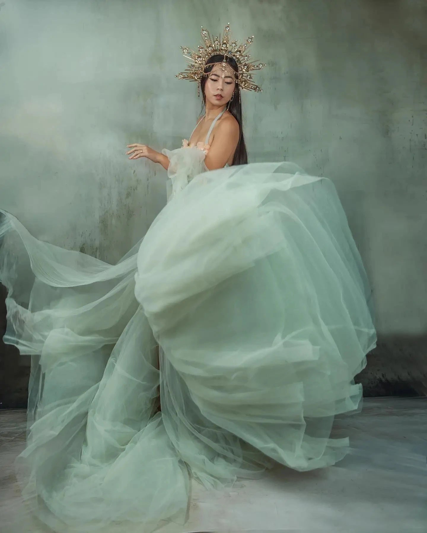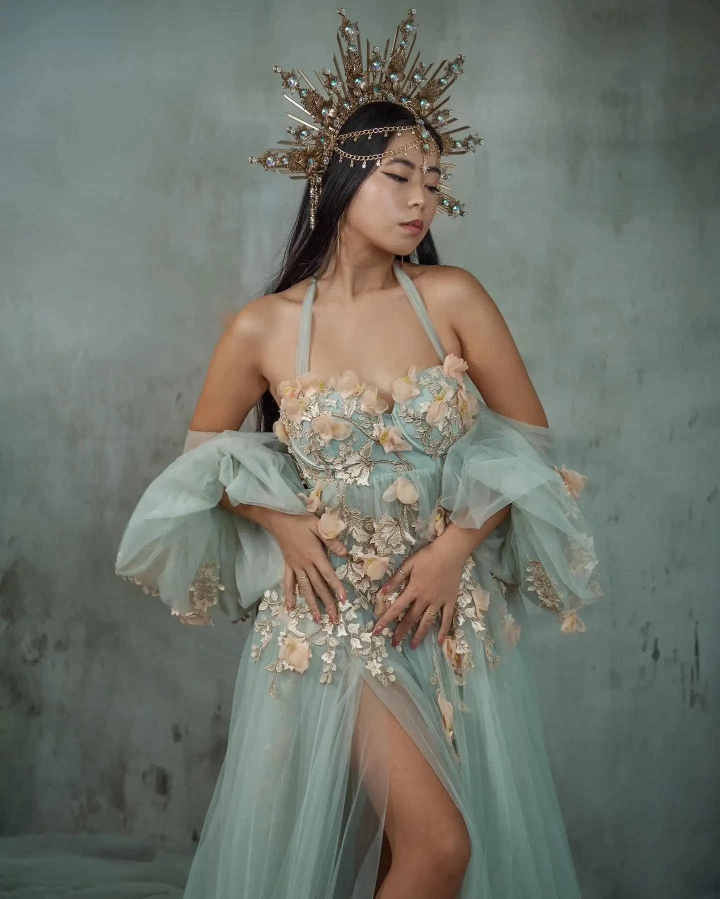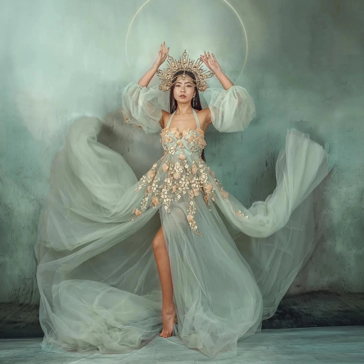 MQTIME - Mint Pregnant Dress To Photography Puff Sleeves Separate A-line Long Maternity Dresses Soft Tulle Floral Women Prom Gowns