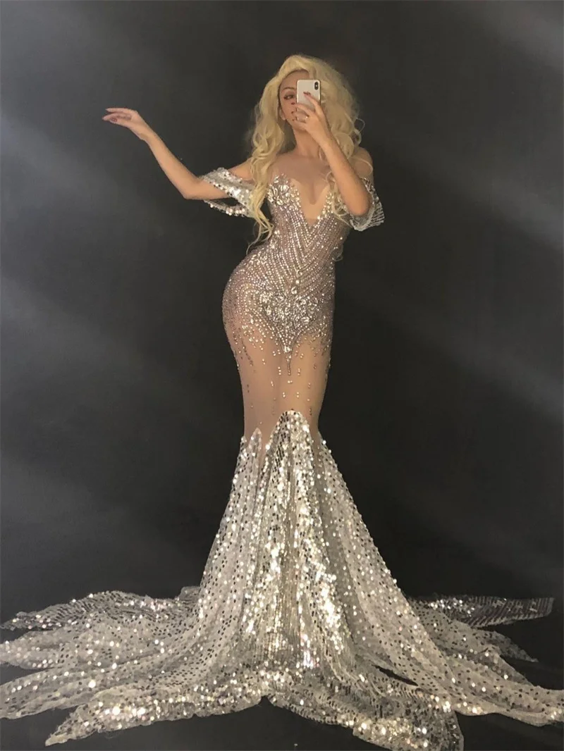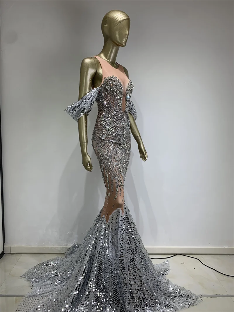 MQTIME - New Arrivals Elegant Shiny Rhinestones Off Shoulder Sexy Maternity Shoot Dress Sequin Fishtail Robe De Soiree