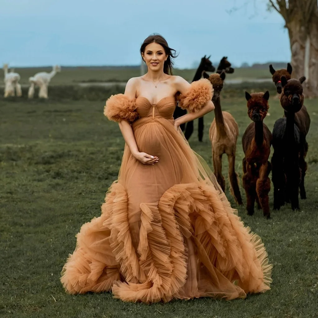 Mqtime New Design Tan Gold Tulle Maternity Dresses for Pregnant Woman Puff Sleeves Ruffled Mesh Maternity Photography Dress Photoshoot