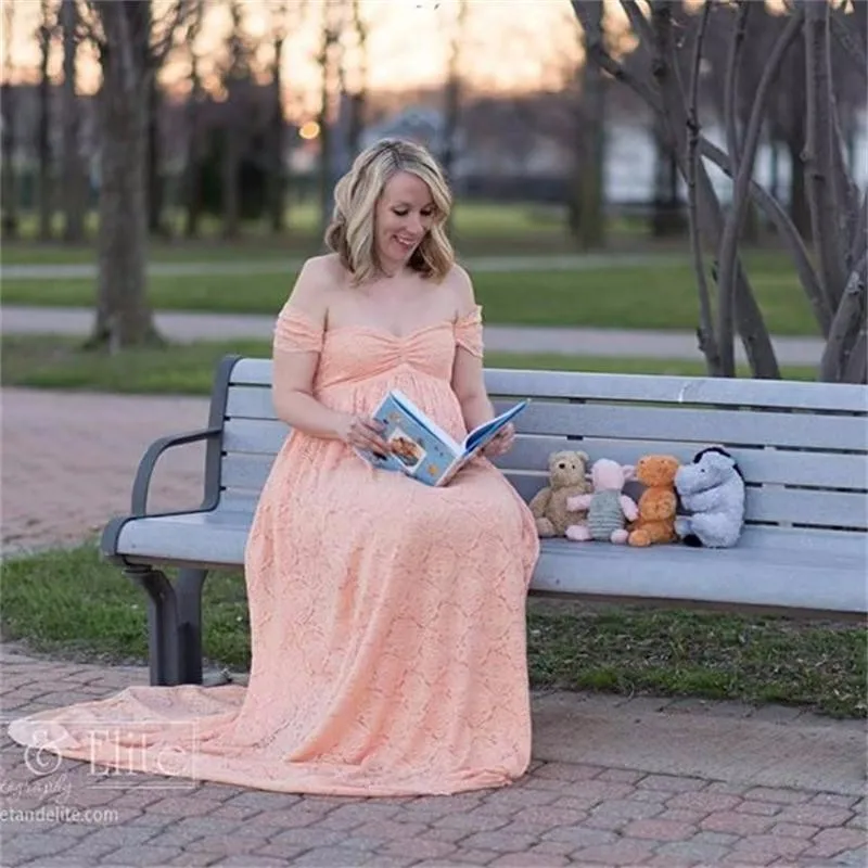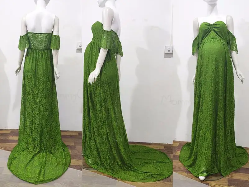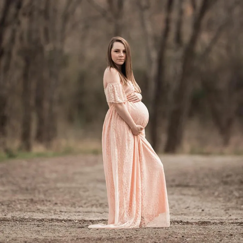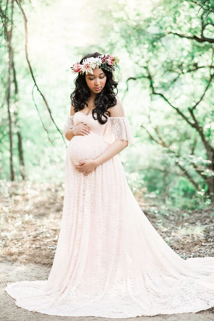MQTIME - Pregnant Women Off Shoulder Ruffle Sleeve Lace Maternity Gown Maxi Photography Dress Elegant Pregnancy Dresses for Photo Shoot