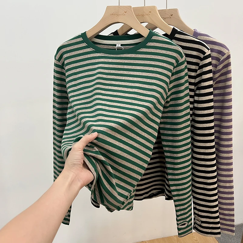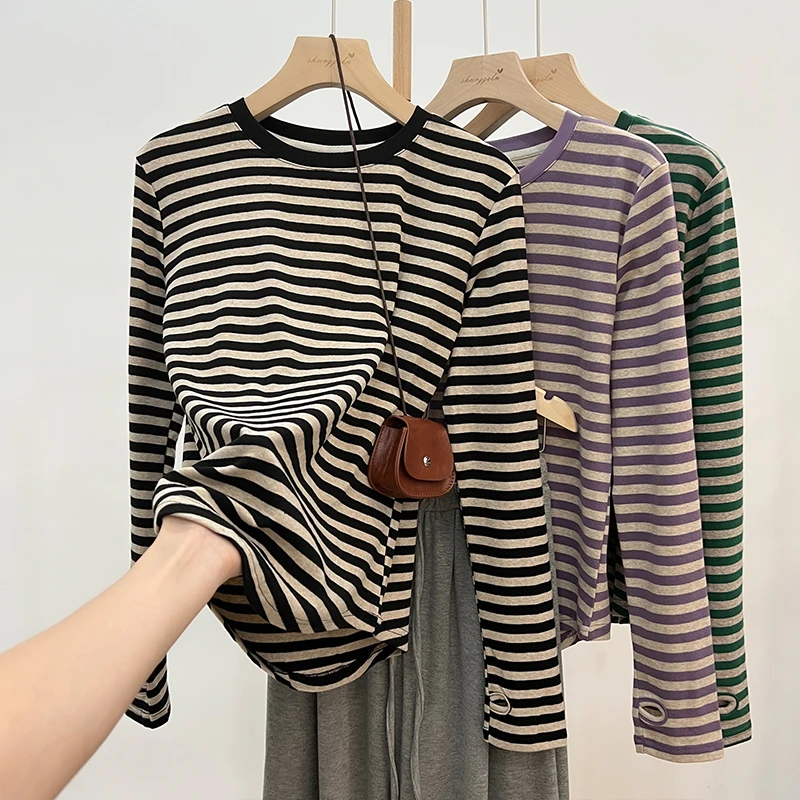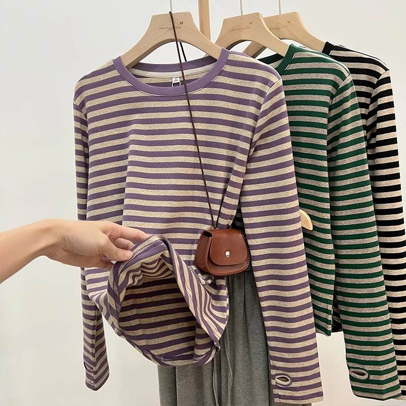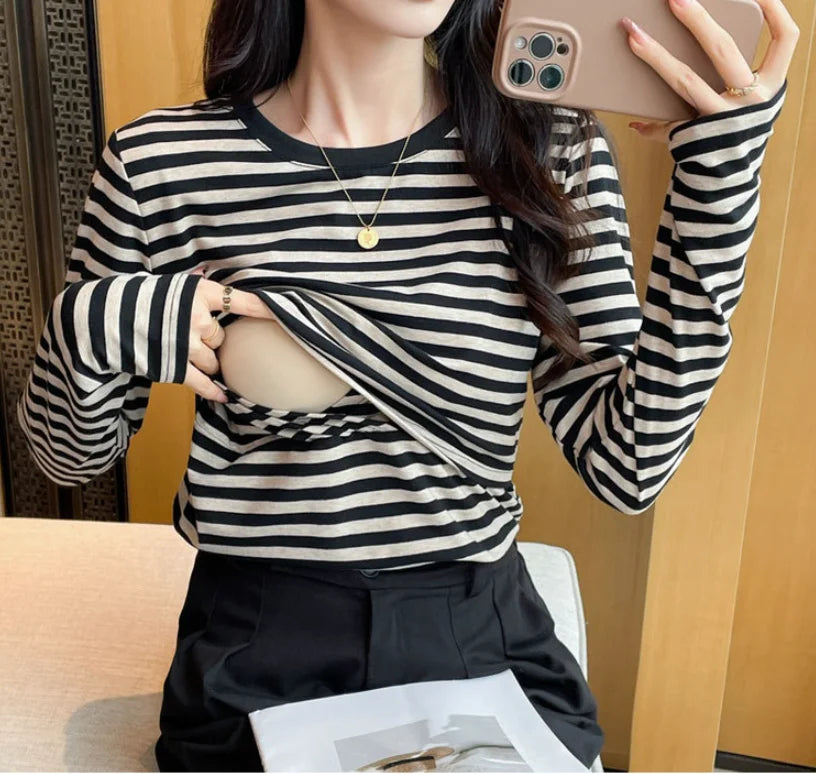 Mqtime Purple Black Autumn Long Sleeve Maternity O-Neck Nursing Top Breastfeeding Striped Shirt Postpartum Woman Zip Fly Lactation Tees