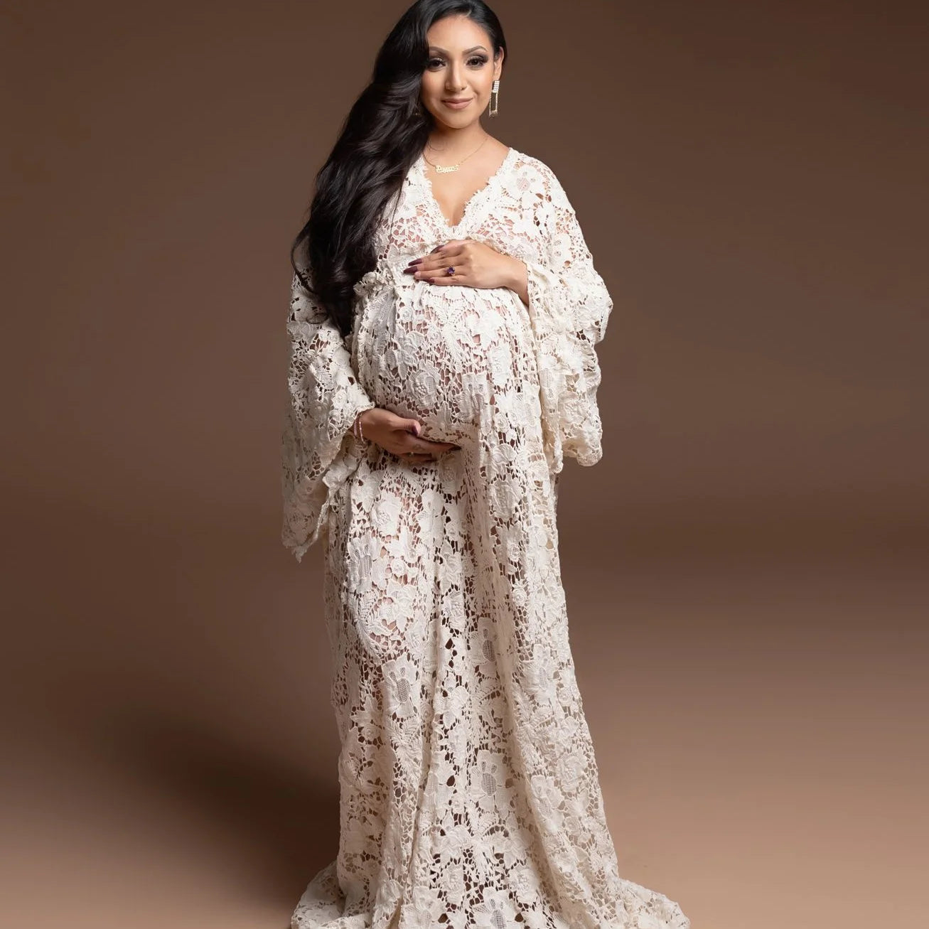 MQTIME  -  V Neck Pregnant Women's Prom Dress Maternity Lace Long Sleeve Robes for Photo Shoot or baby shower Luxury Plus Size Gowns