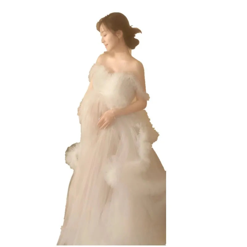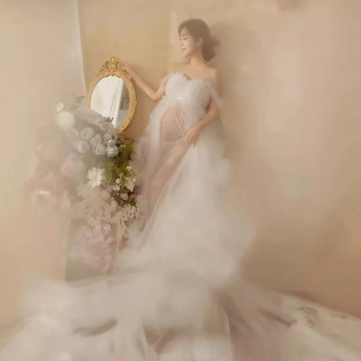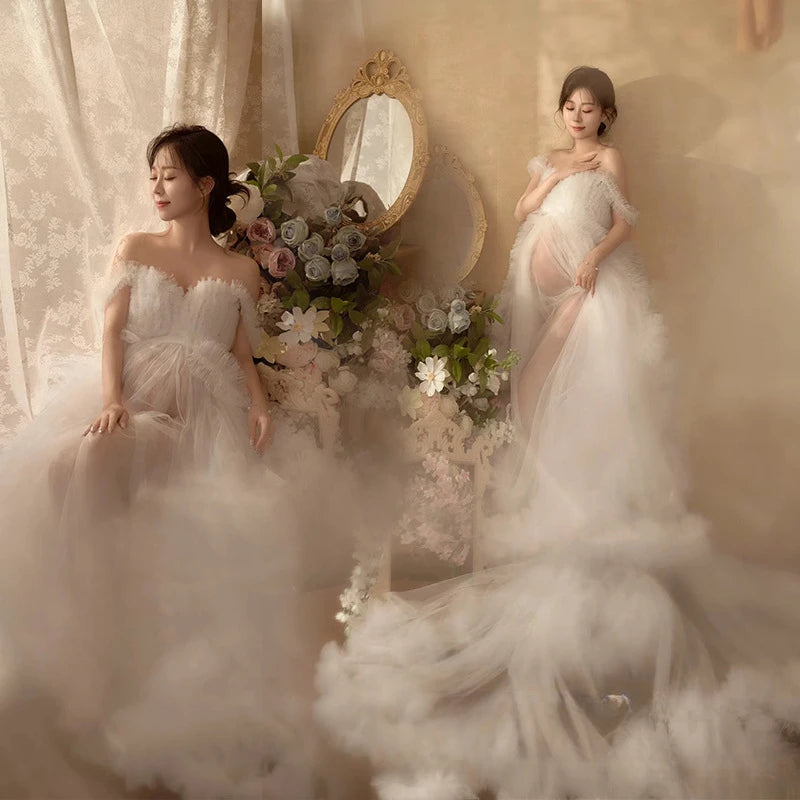 MQTIME - Women Elegant Heavy Embroidery White Off Shoulder Train Maternity Wedding Gown for Pregnancy Photo Shoot Studio Portrait Dress