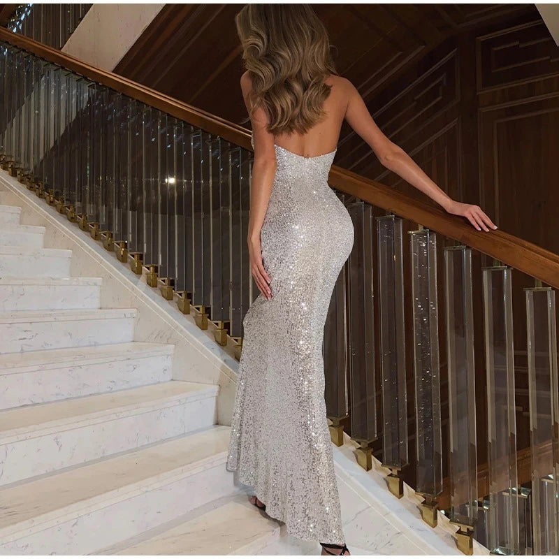 MQTIME  -  Elegant Shiny Long Dress Women Slim Halter Backless Sleeveless Sequin Vestido Female Spring Summer High Waist Party Dresses