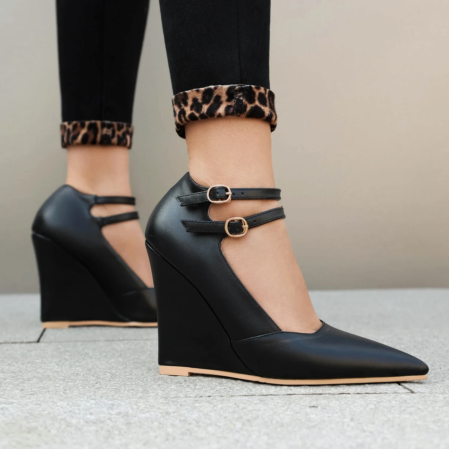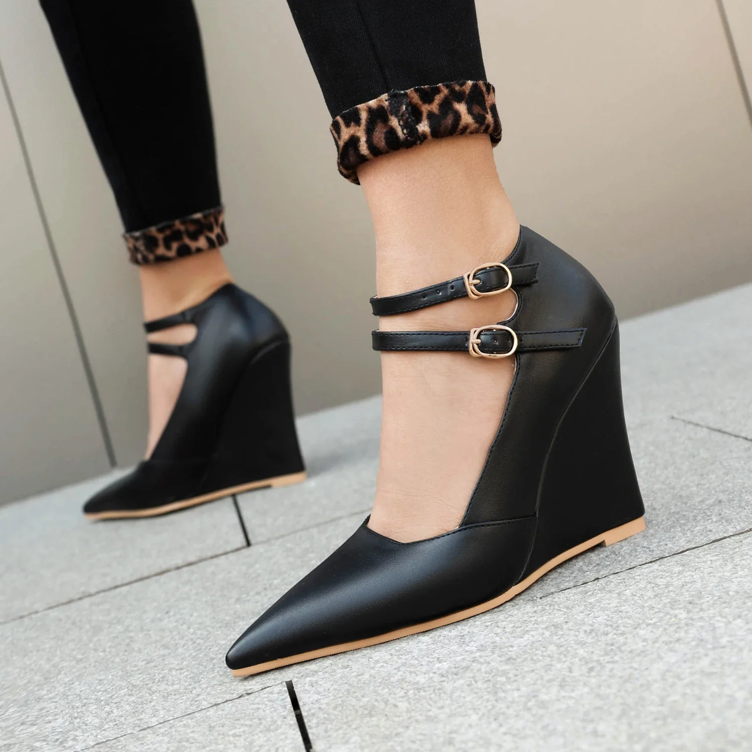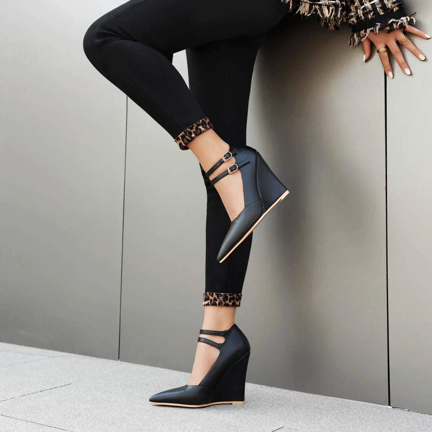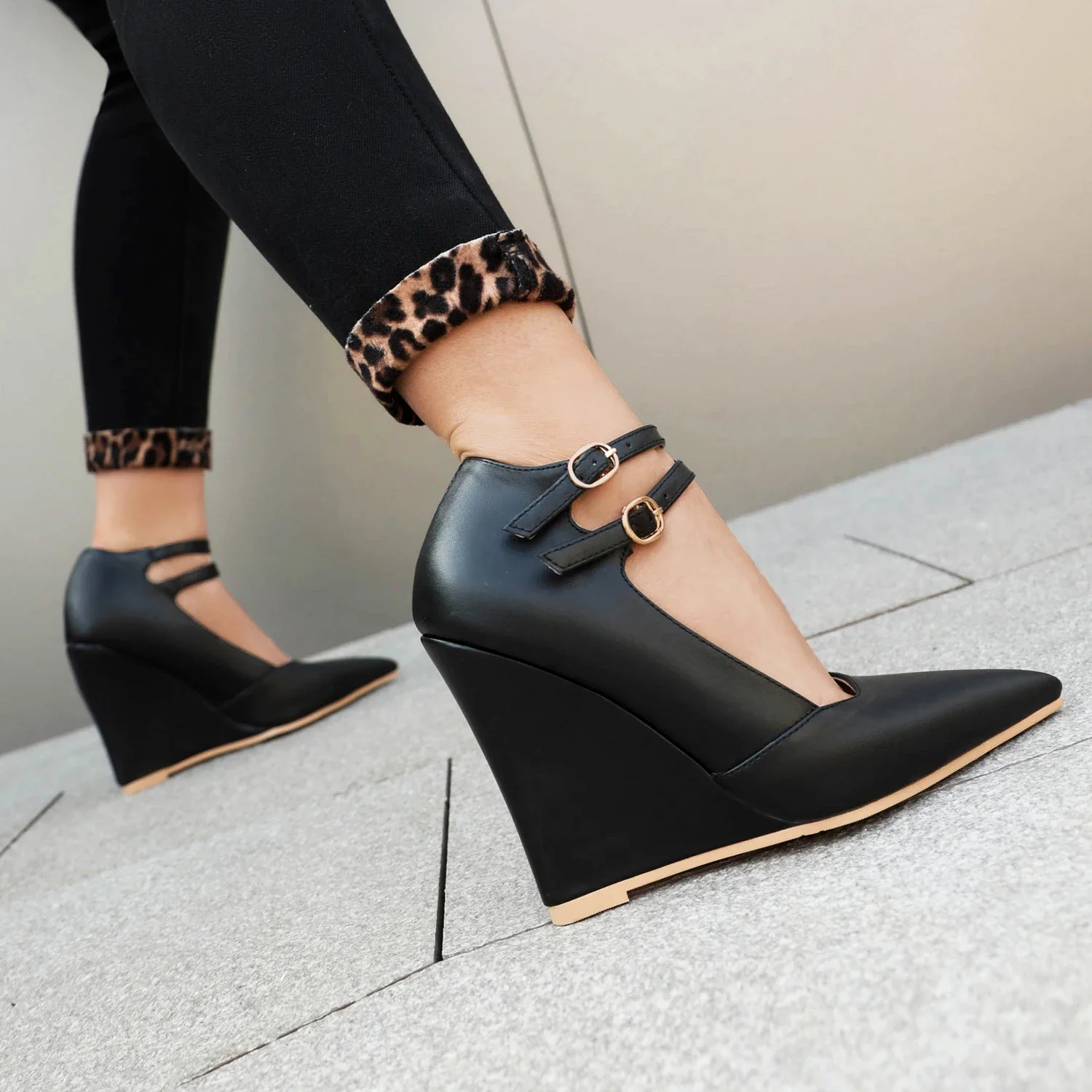 MQTIME - 2024 new spring summer women pumps plus size 22-28cm Superfiber upper pointed toe wedges buckle Mary Jane shoes high heels