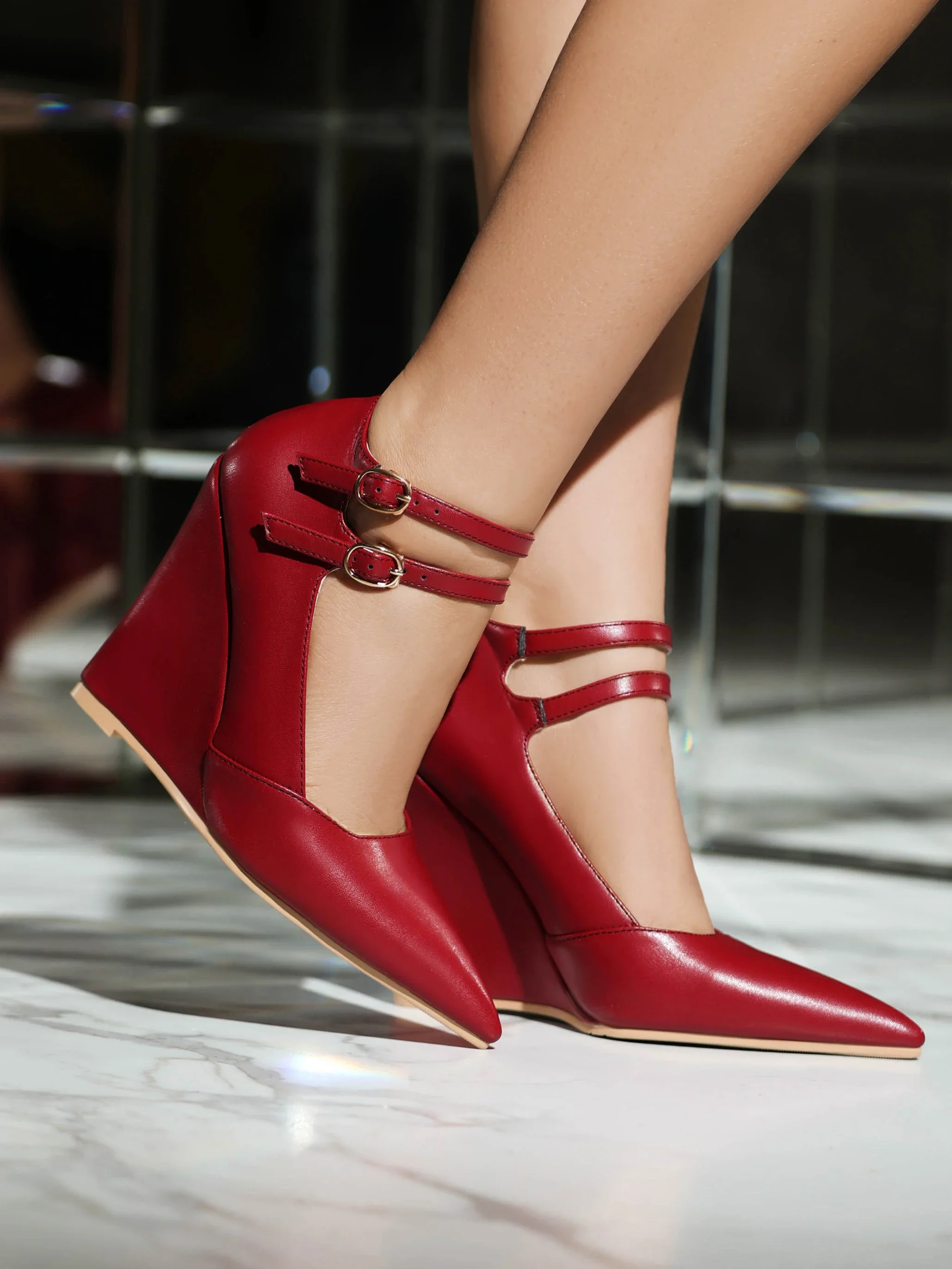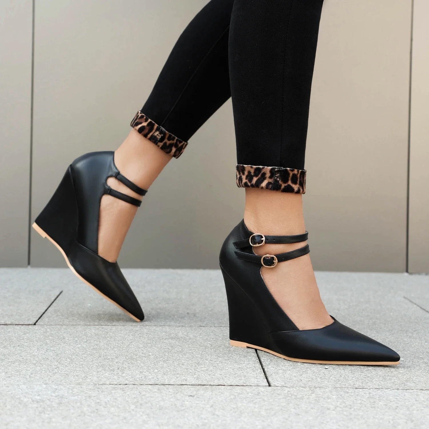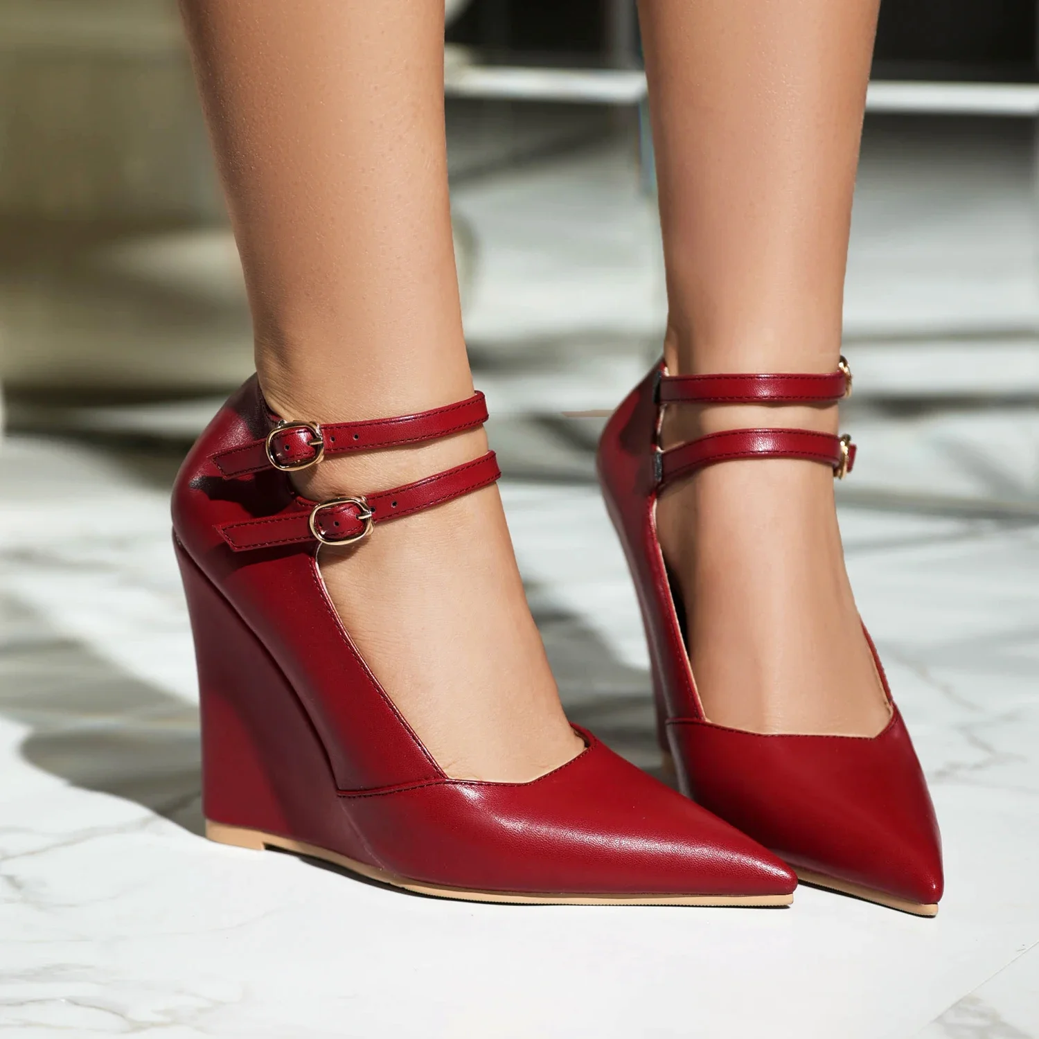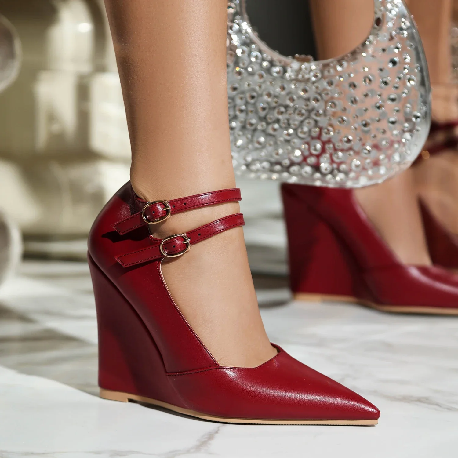 MQTIME - 2024 new spring summer women pumps plus size 22-28cm Superfiber upper pointed toe wedges buckle Mary Jane shoes high heels