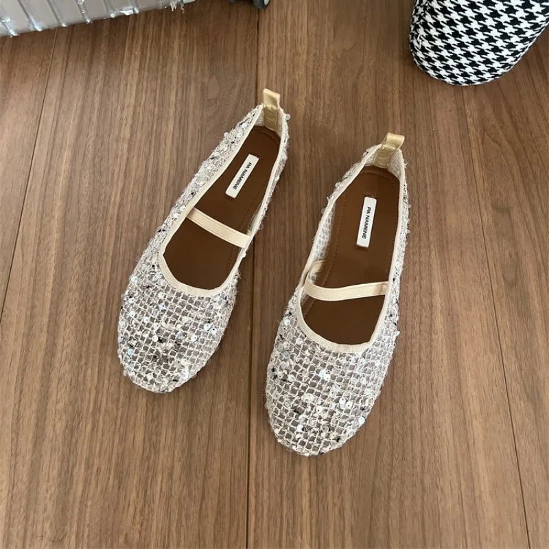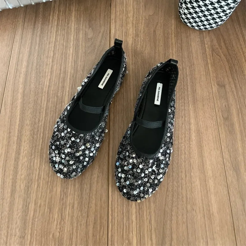 MQTIME - Autumn New Round Head Sequins Breathable Mesh Women's Shoes Soft Sole Casual Shallow Mouth Single Flat Shoes Ballet