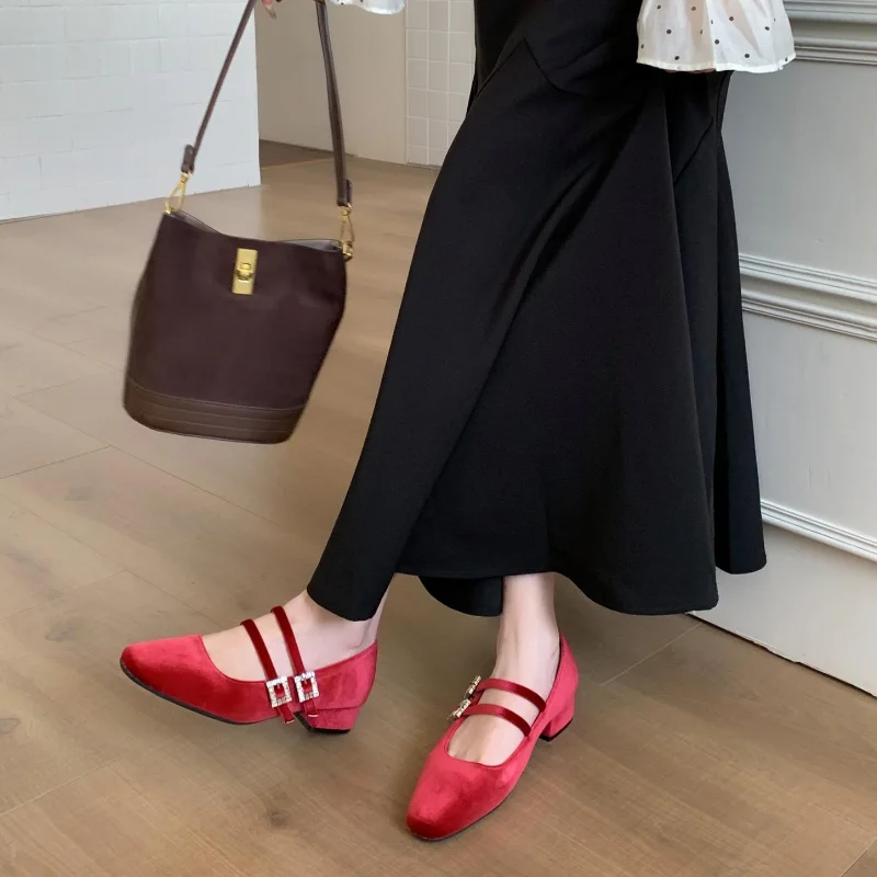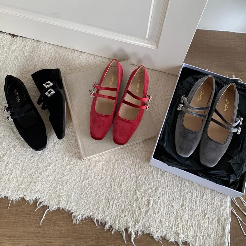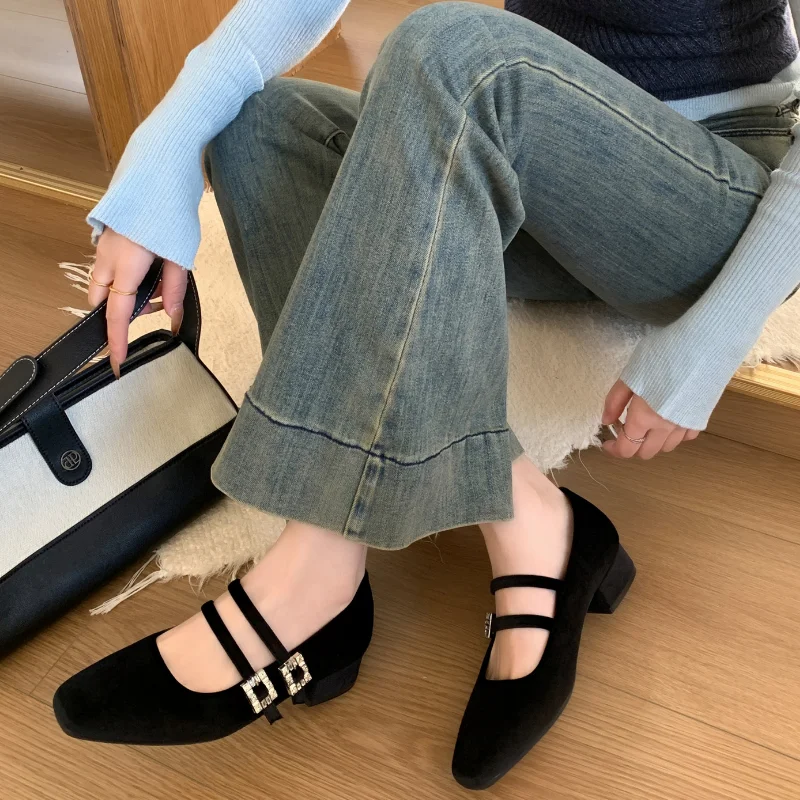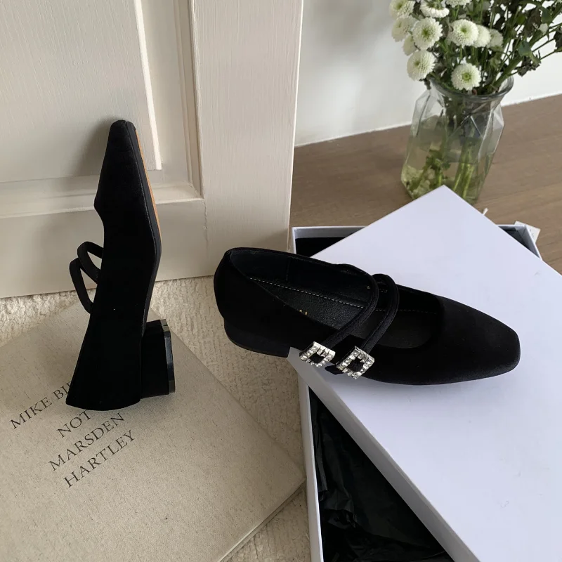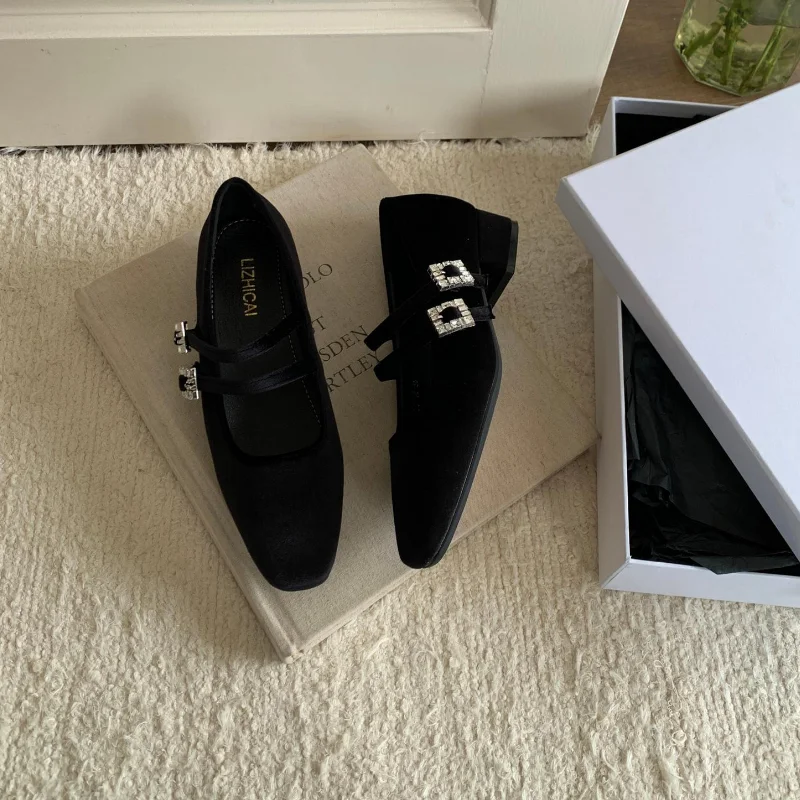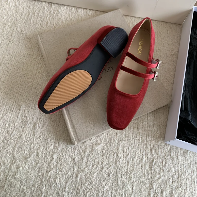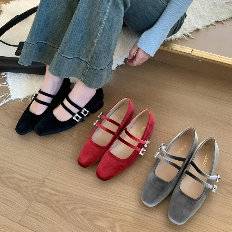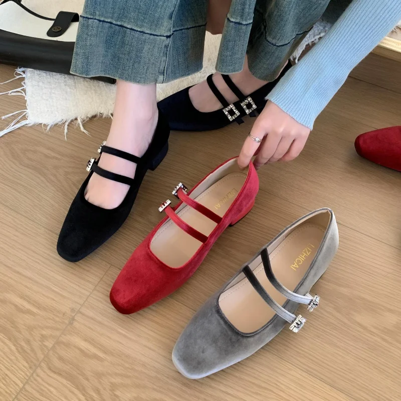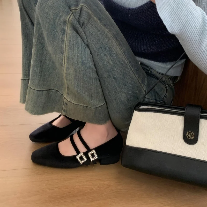 MQTIME  -  Crystal Ballet Low Heel Shoes Female Velvet Square Toe Shallow Spring Footwear 2025 New Design Women's Outdoor Mary Jane Shoes