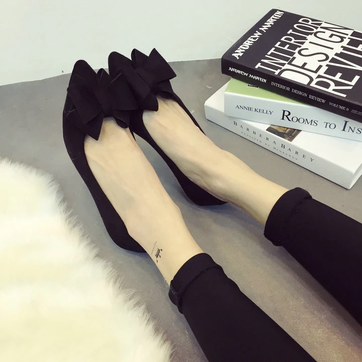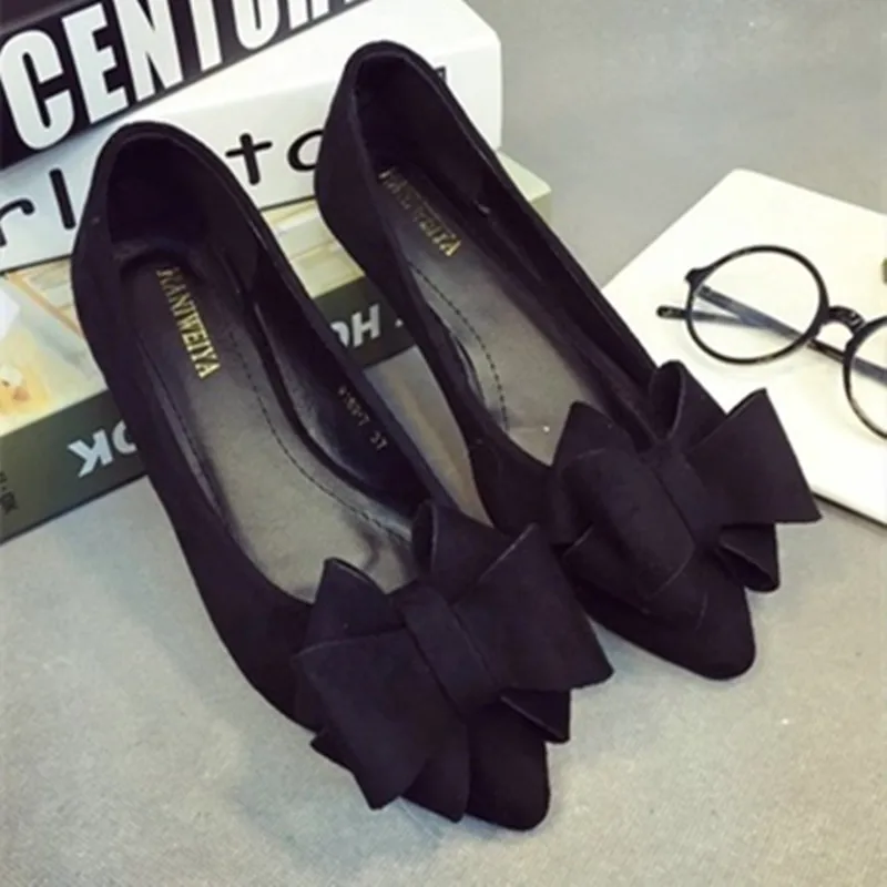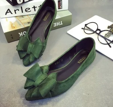 MQTIME - Lady Pointed Toe Flats Ballerinas Sweet Bow Shoes Nubuck Leather Woman Comfortable Loafers Big Size 43 42 48 Green Slip-on Black