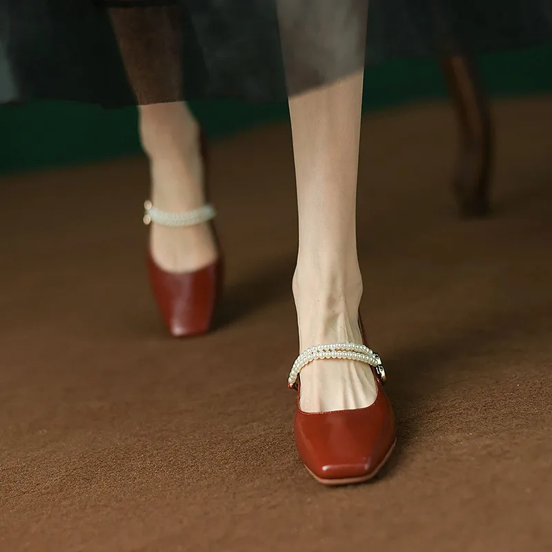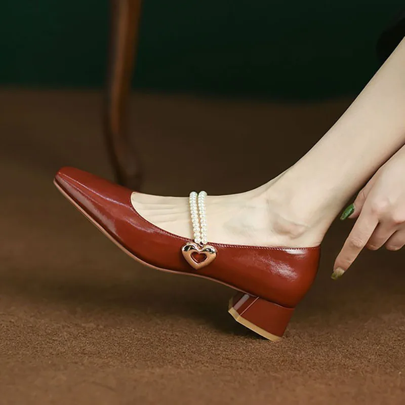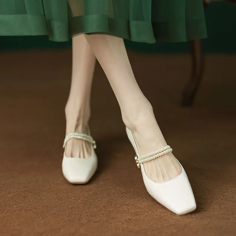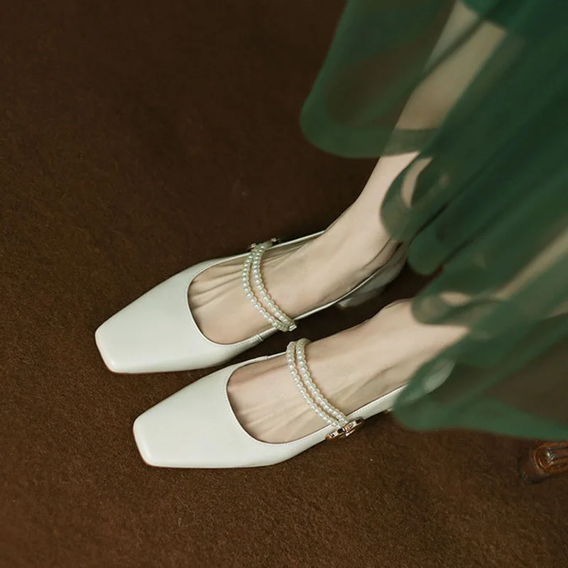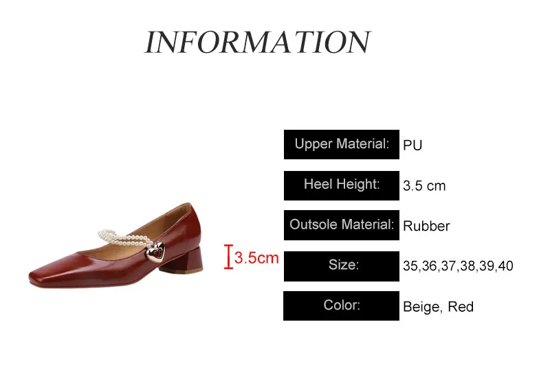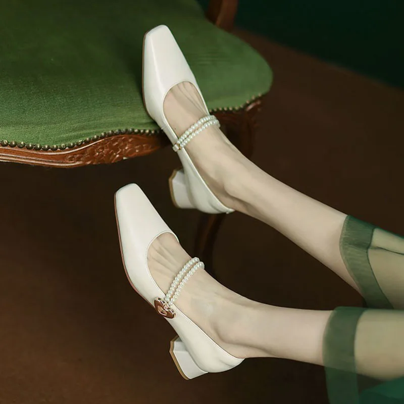 MQTIME - New Women's Mary Janes Shoes Pearls Heart Buckle Pumps Mid Heels Square Toe Patent Leather Dress Shoes White Wedding Shoes 9899N