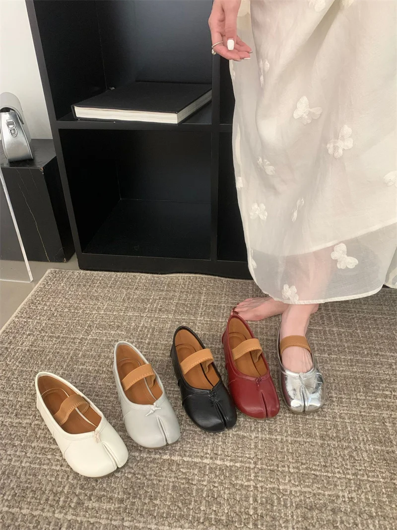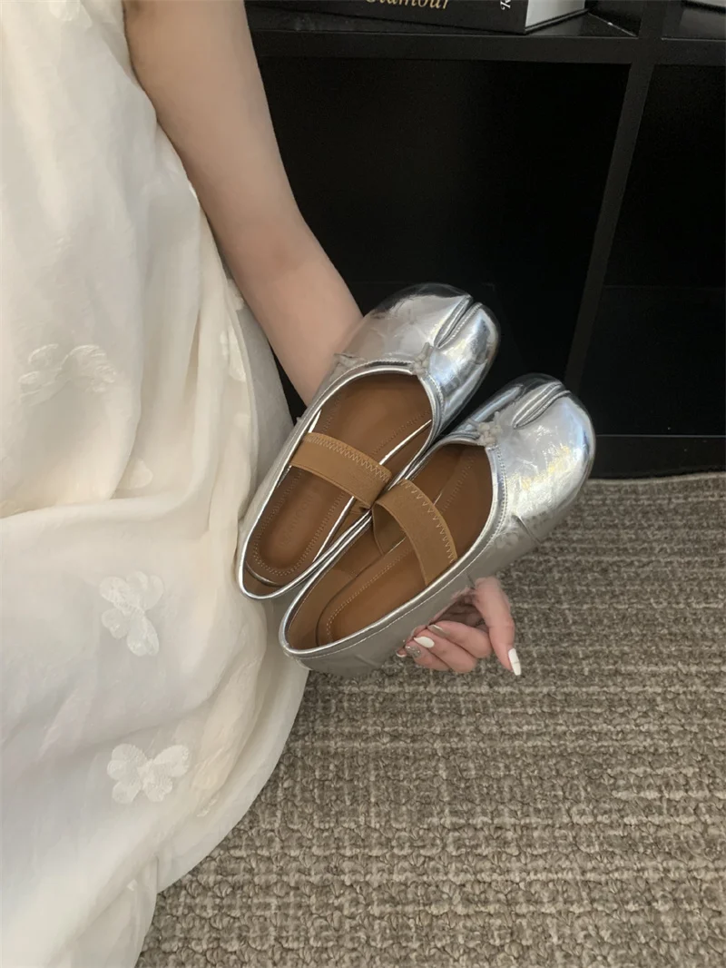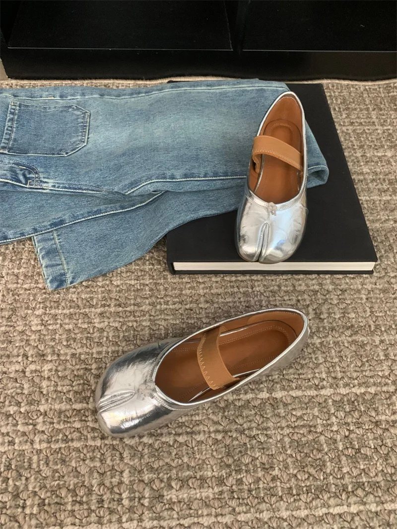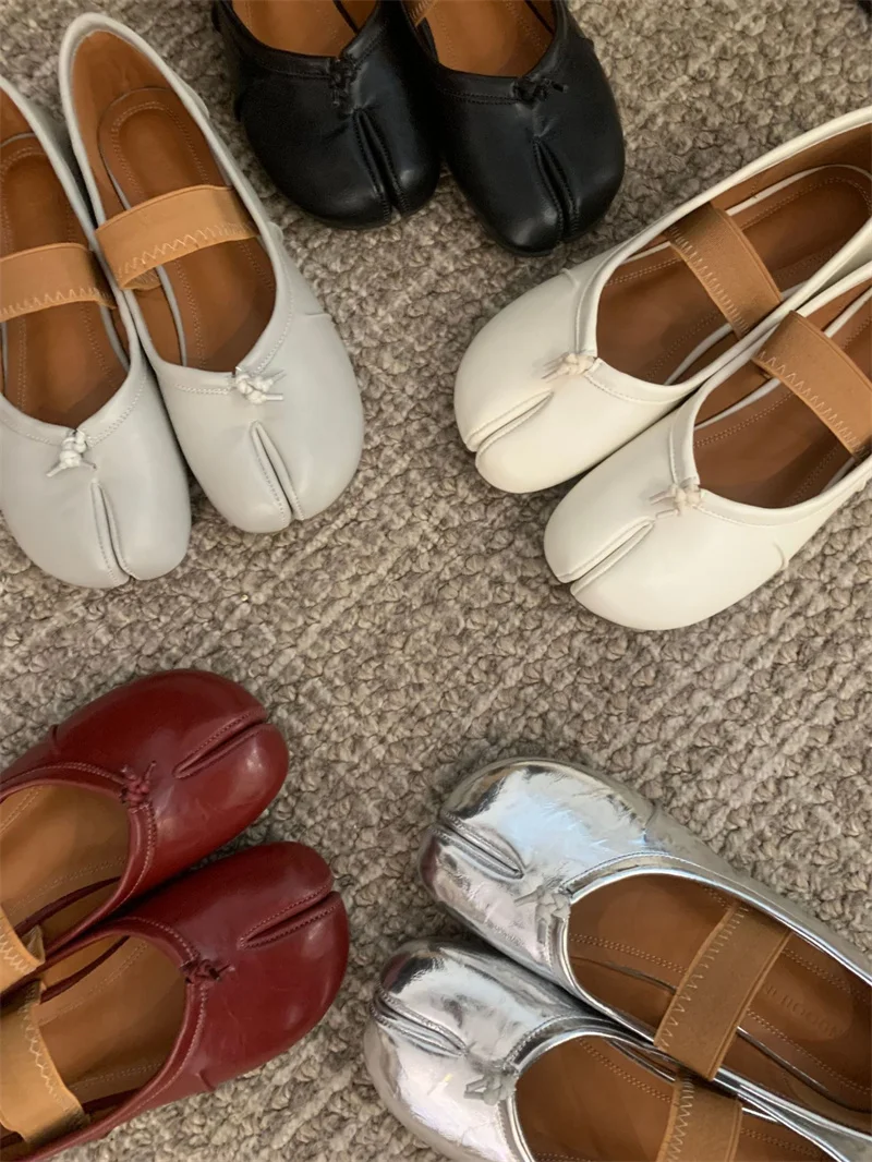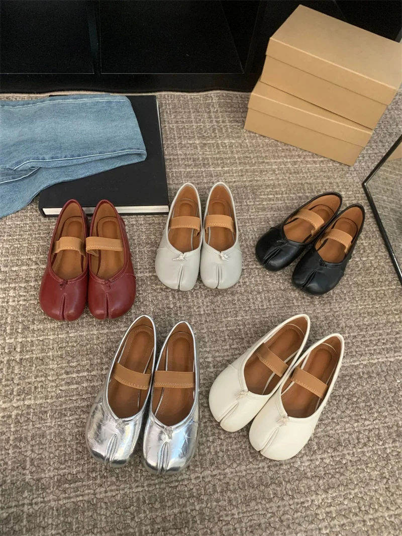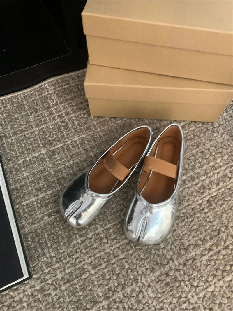 MQTIME - Silver Split Toe Flats Ballet Women Elastic Band Ballerina Shoes Leather Red Ballerinas Zapatos mujer