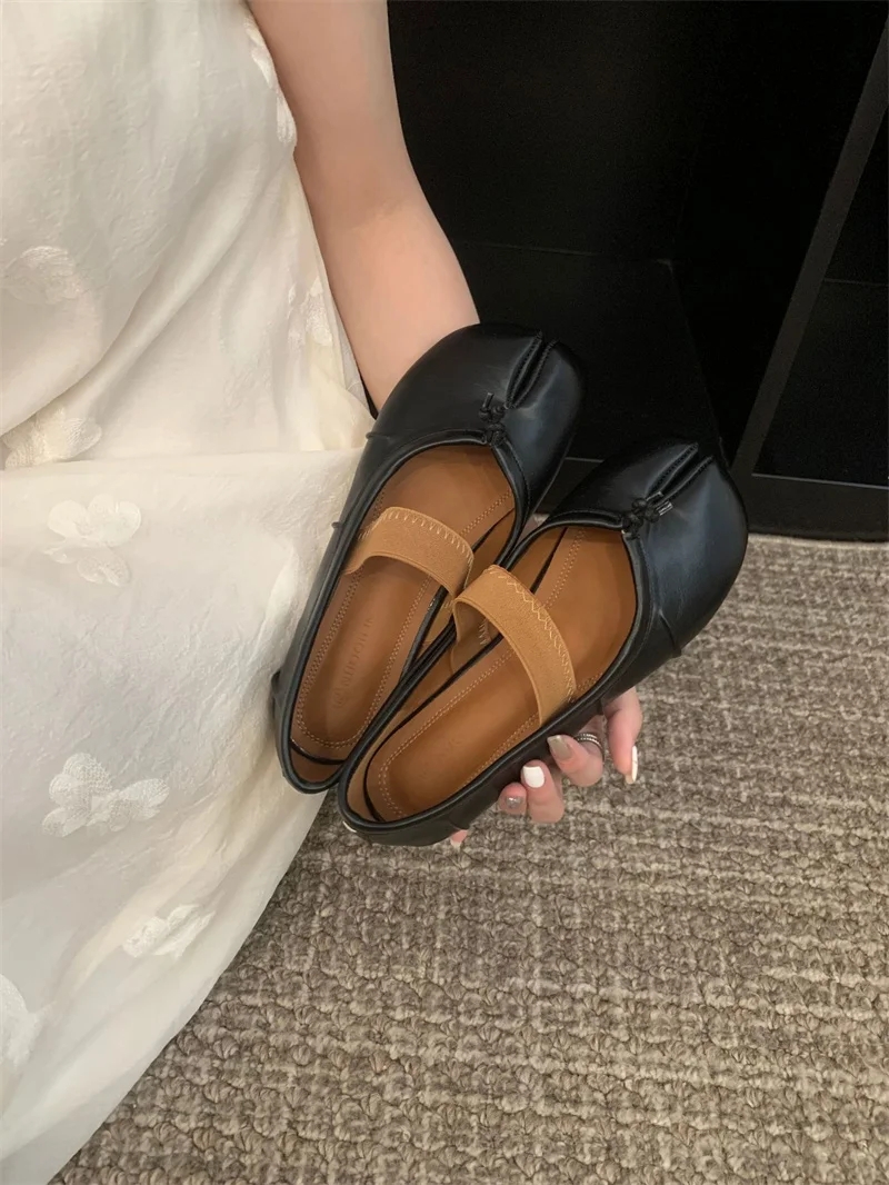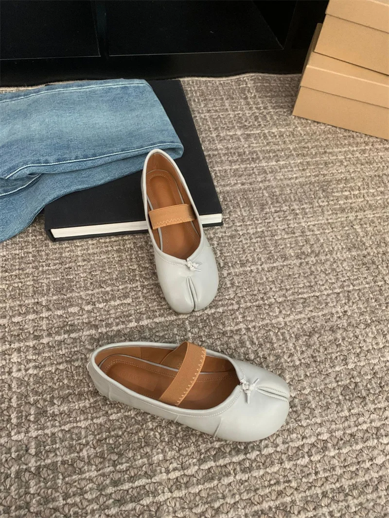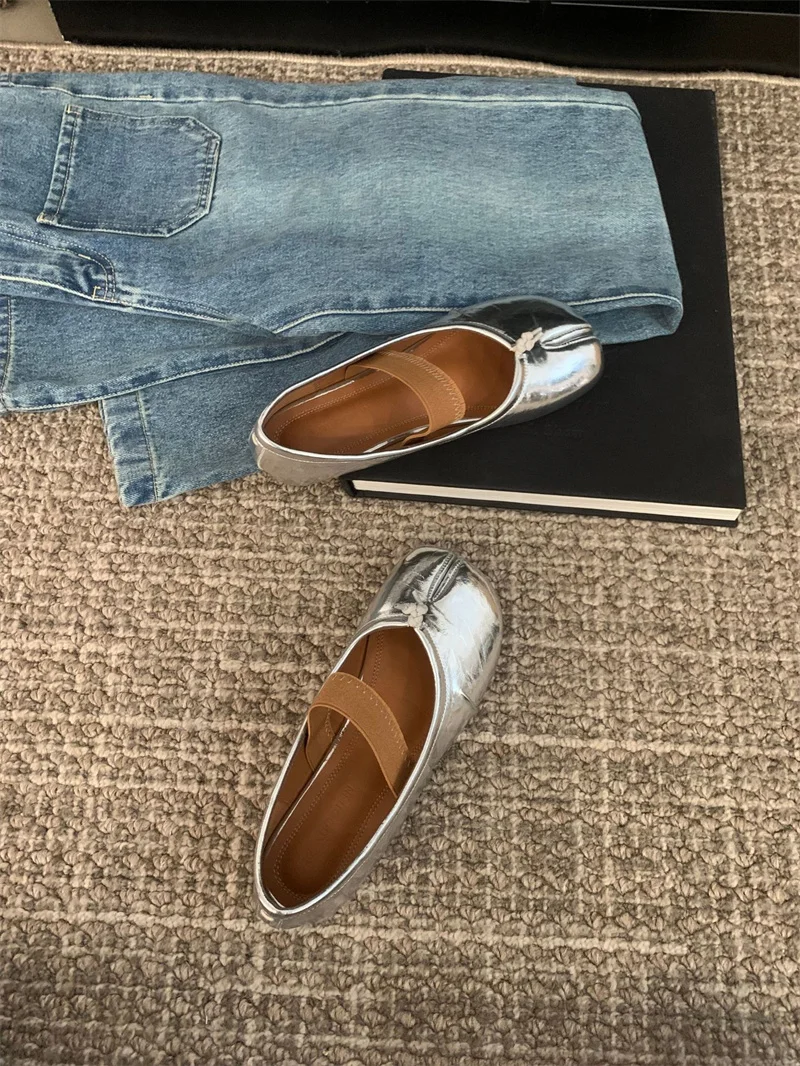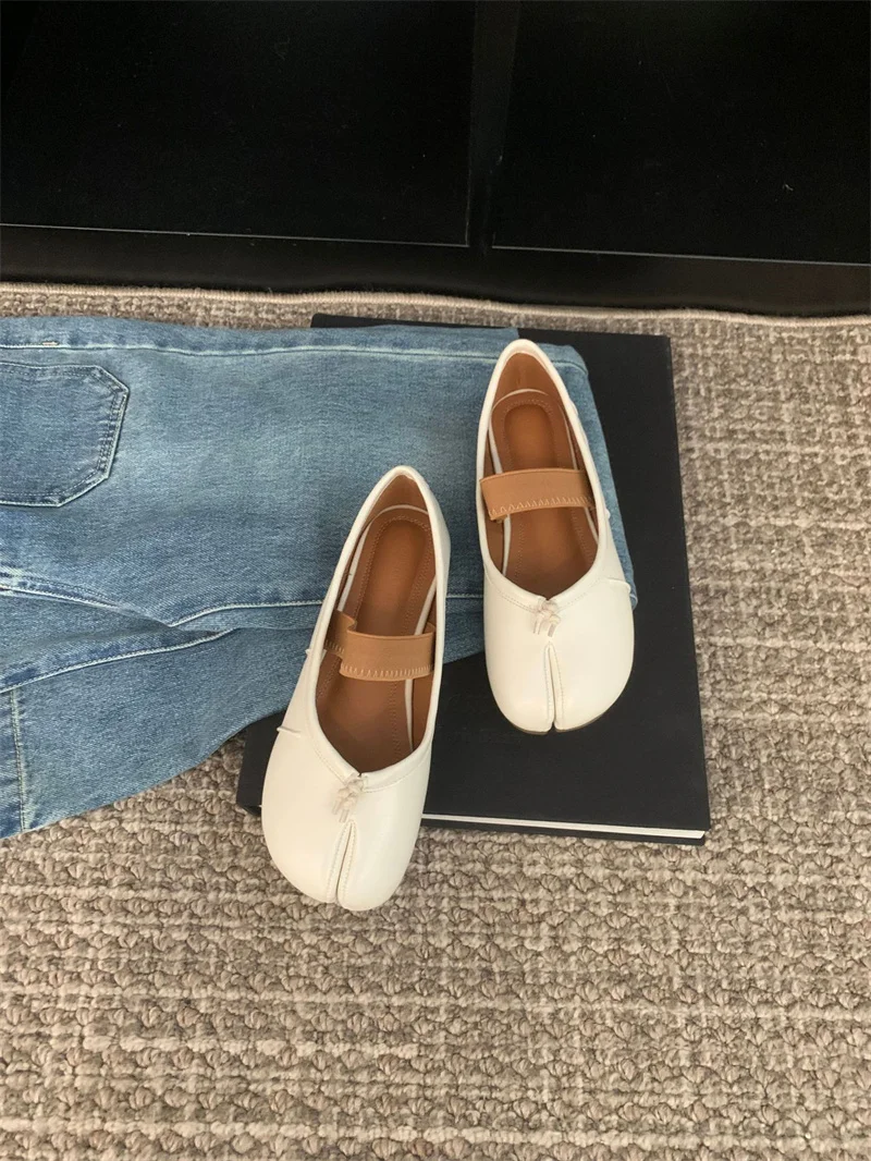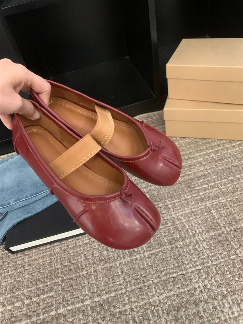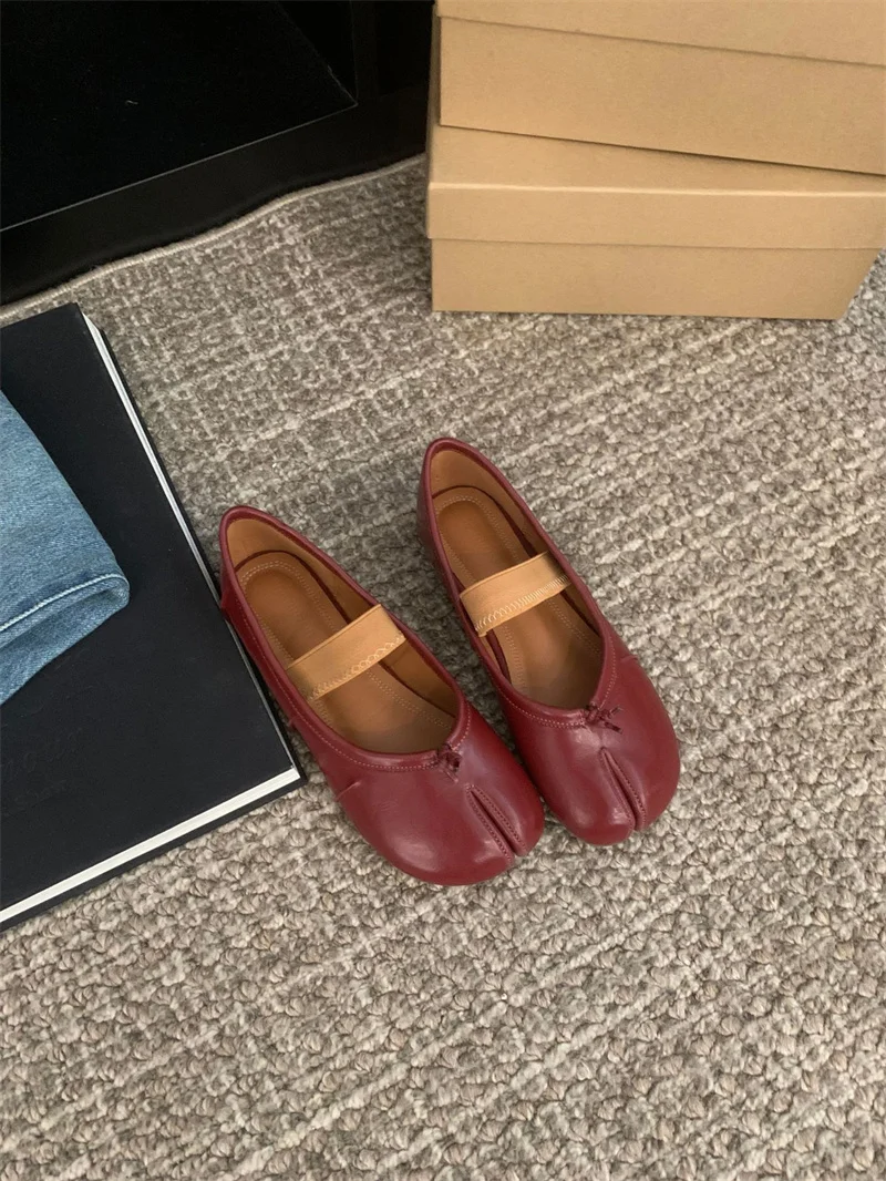 MQTIME - Silver Split Toe Flats Ballet Women Elastic Band Ballerina Shoes Leather Red Ballerinas Zapatos mujer