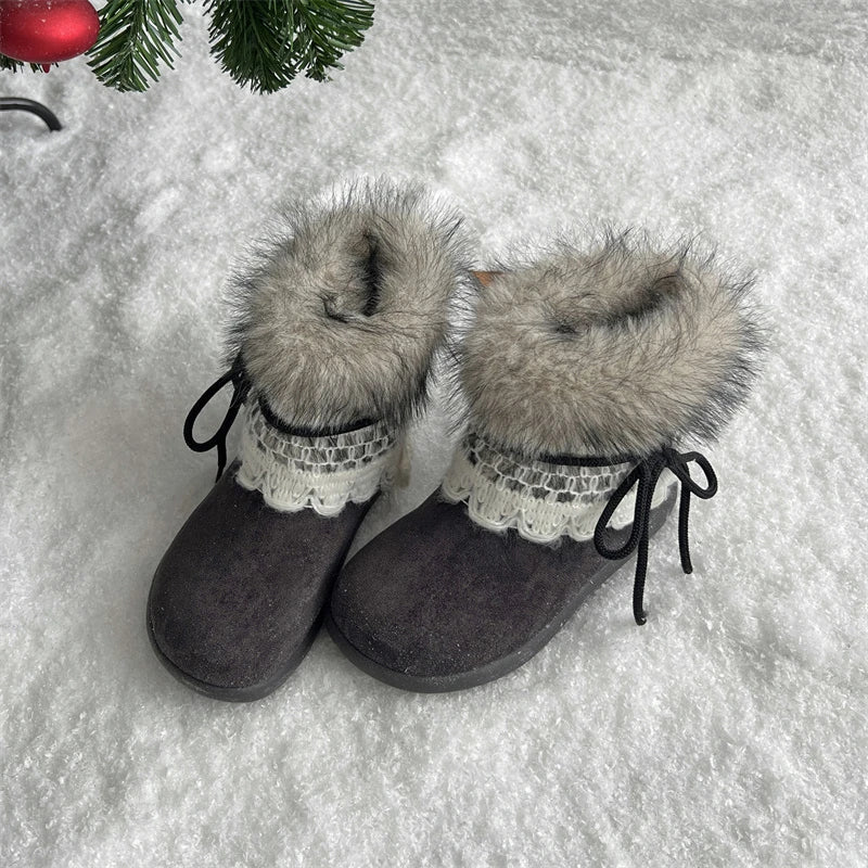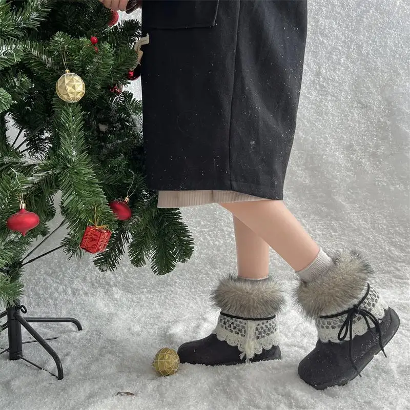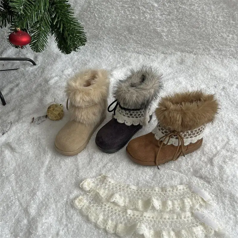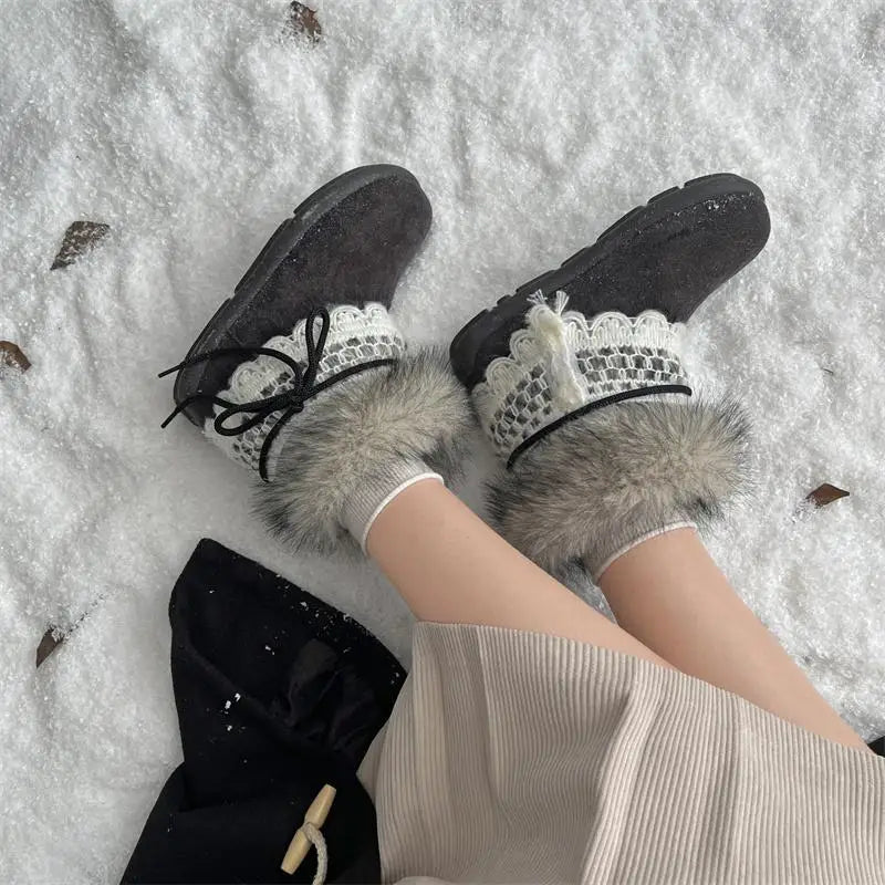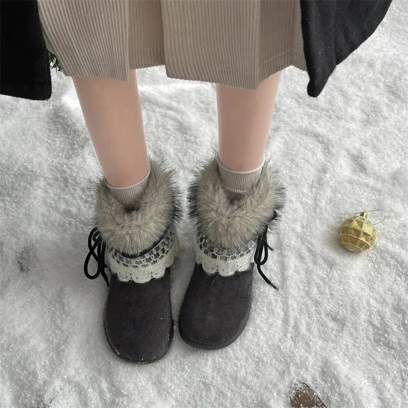 MQTIME - Sweet Lace Decoration Furry Suede Snow Boots Women Winter Thick Bottom Fluffy Fur Ankle Boots Warm Plush Designer Shoes