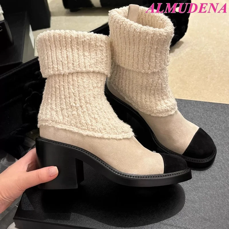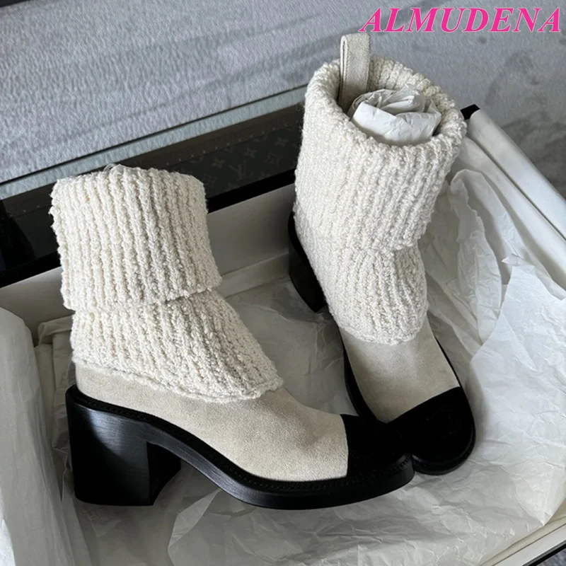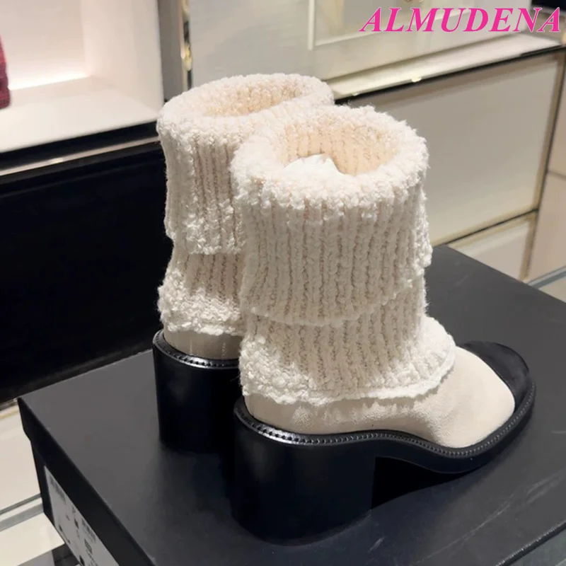 MQTIME - Women's 2025 New in Black and White Chunky Heel Sock Boots Luxury Designer Round Toe Booties Elegant Party Knit Shoes