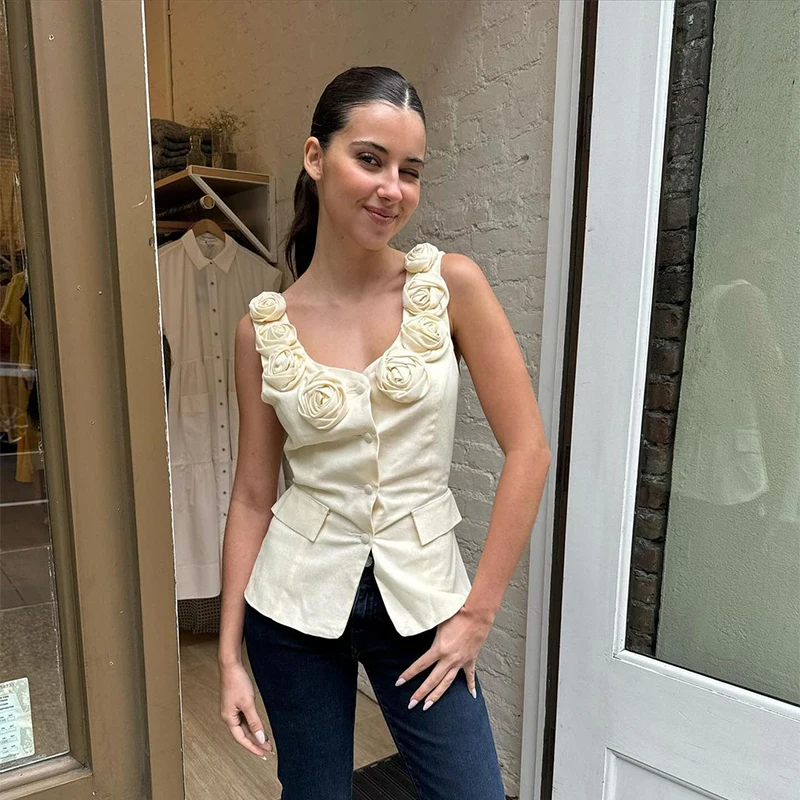 MQTIME - 3D Rose Flower Sleeveless Vests Women 2024 Slim Fit V-neck Flowers Tops Summer Sexy Chic Single-Breasted Casual Outwear