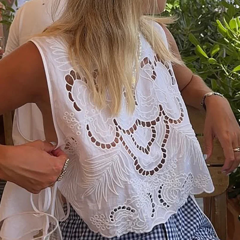 MQTIME - Boho Style Sleeveless Beachwear T-shirt New Spring Summer O-neck Vest Tops for Women Sexy Embroidery Hollow Out Lace Shirt Mujer