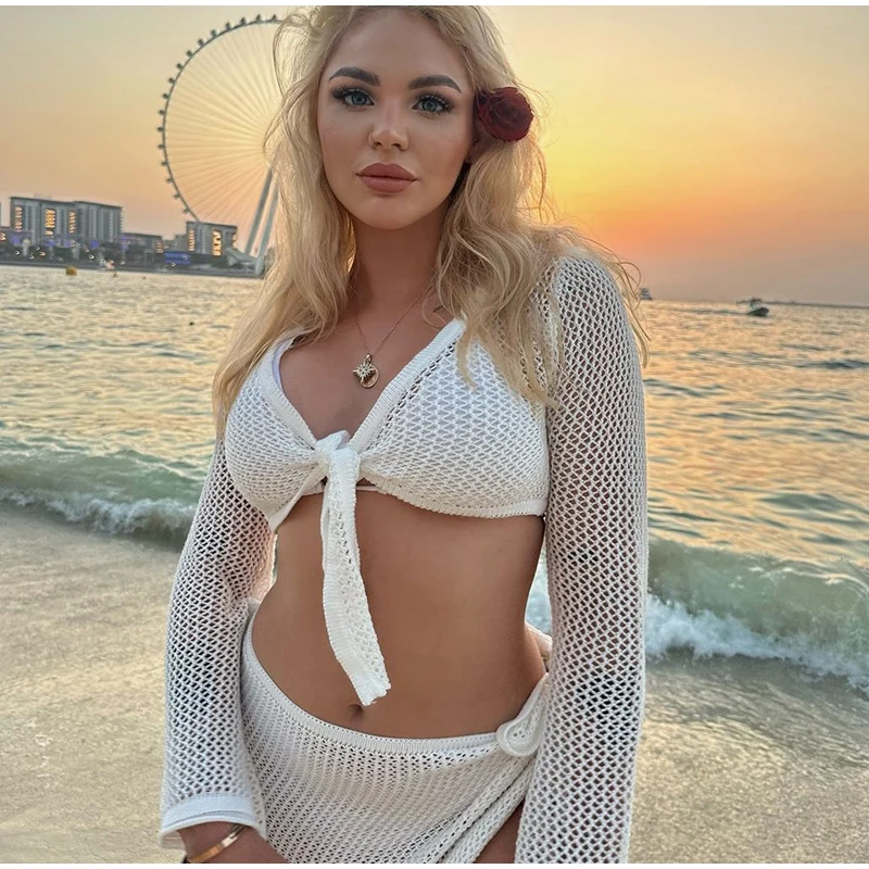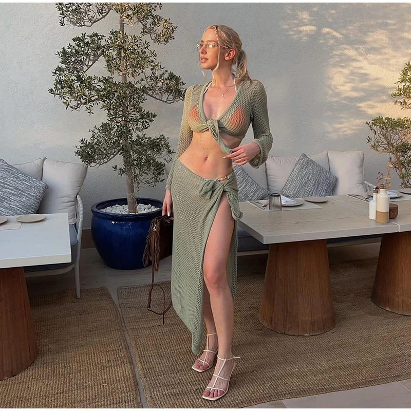 MQTIME - Knitted Hollow Out Tops Skirts Sets Women Sexy V-neck Lace Up Skirt Long Sleeve Top Set Female Casual Loose Outfit Beach Holiday