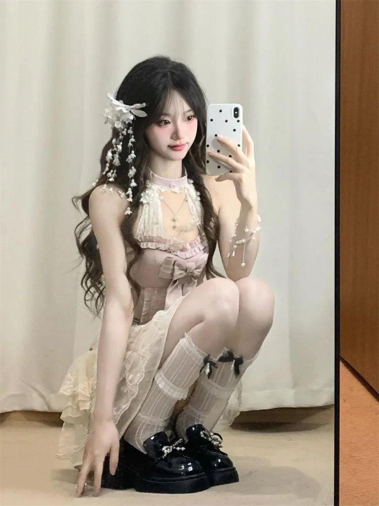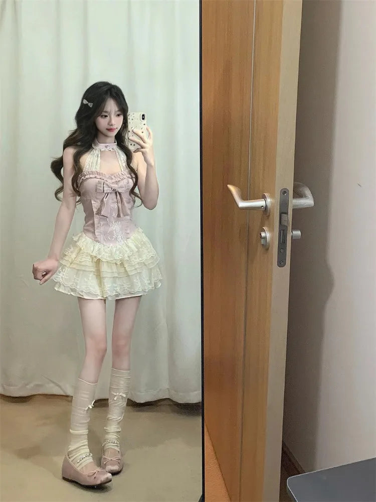 MQTIME - Korea Sweet Lace Two Piece Set Women Pink Bow Hollow Out Tops + Layered Ruffle Skirt Suit Elegant Princess Fairy Style Outfit
