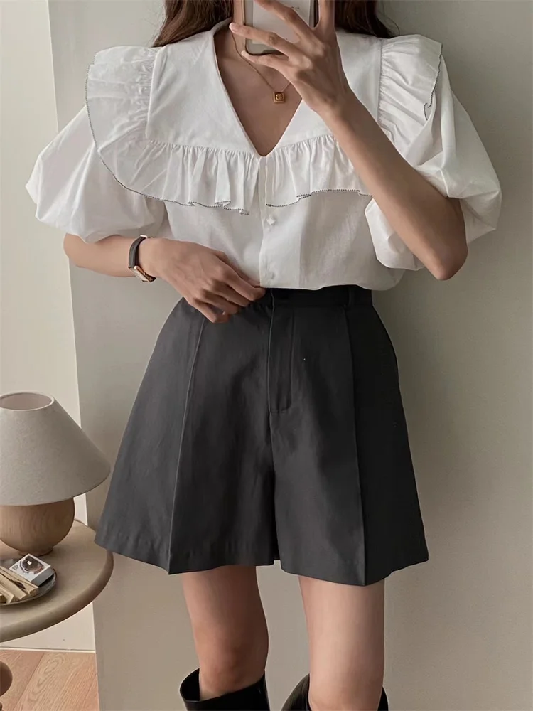 MQTIME  - Korean Style Female Shirts Summer Minimalist Navy Collar Ruffle Stripe Blouse Loose Single Breasted Short Bubble Sleeve Tops