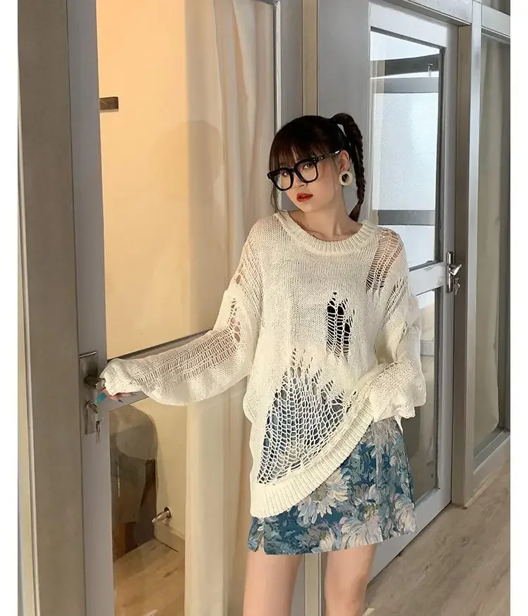 MQTIME  -  Oversized Sexy Hole Sweaters Loose Casual O-neck Knitted Solid Korean Fashion Black Chic Daily Trendy Long Sleeve Pullovers Tops