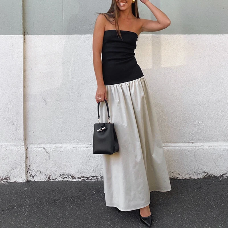 MQTIME - Sexy Tube Tops One Shoulder Banquet Party Dress Fashion Contract Color Swing Stitching Long Dress Women Folds Sleeveless Dress