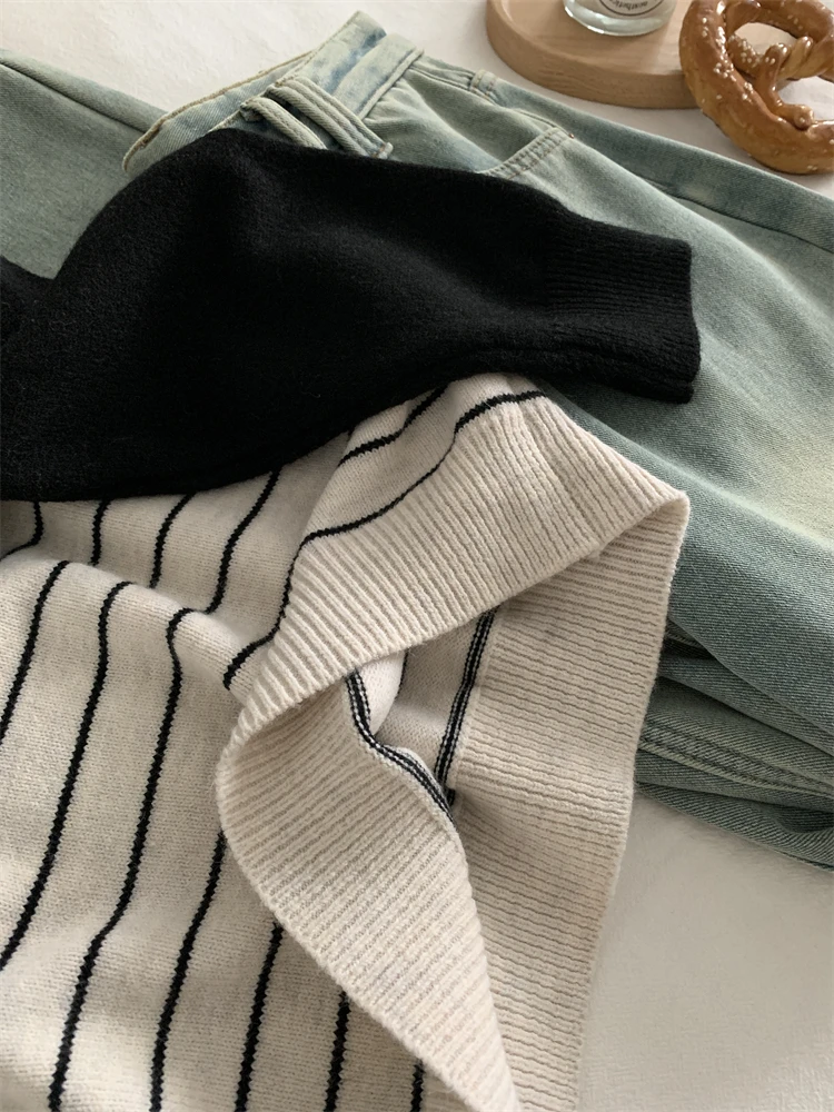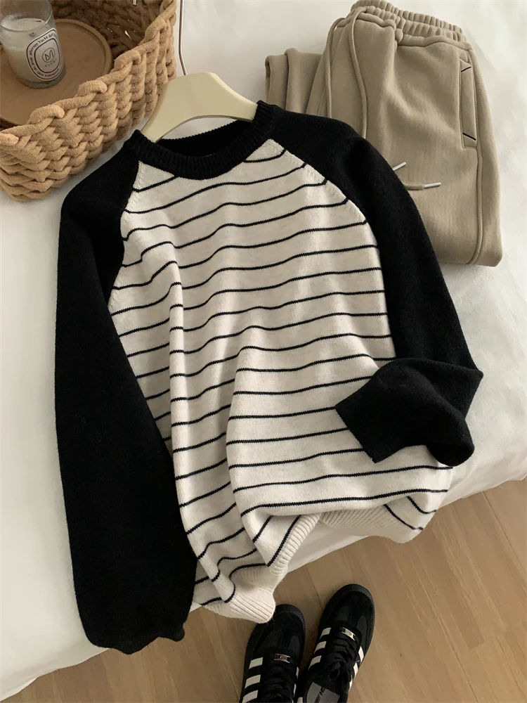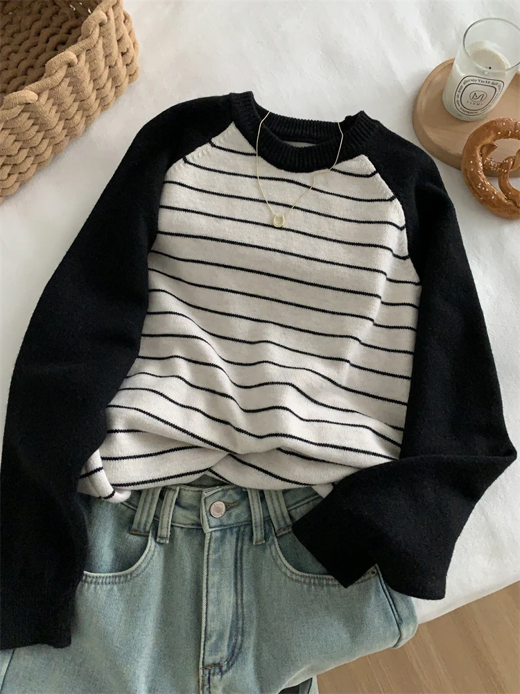 MQTIME - Striped Round Neck Knitted Sweater For Women Loose Casual Simple Raglan Sleeves Tops