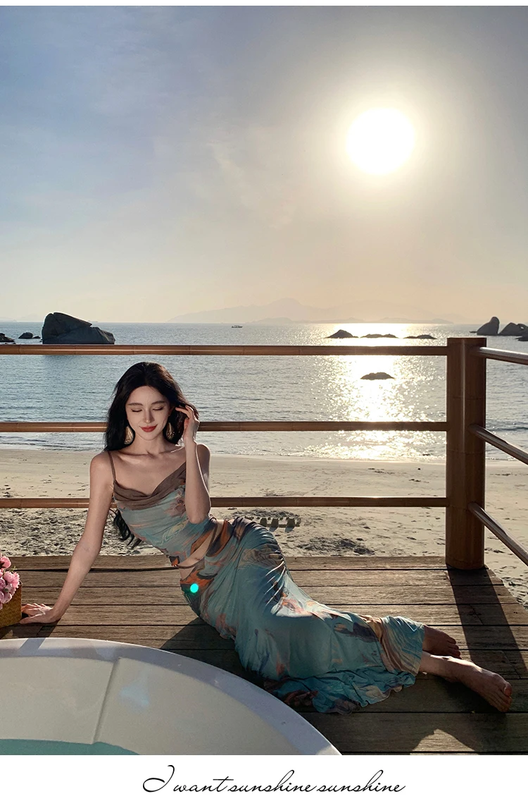 MQTIME - Summer Holiday Blue Print Two-piece Set Women Backless Spaghetti Strap Short Tops + High Waist Pleated Long Skirts Suit Bohemian