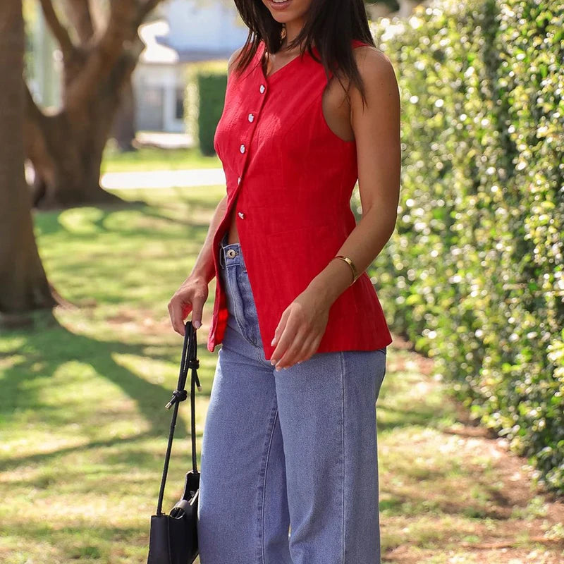 MQTIME  -  Summer Solid Color Sleeveless Vest Office Lady Single Breasted O Neck Open Front Short Tops Leisure Simple Women Pocket Tank Top
