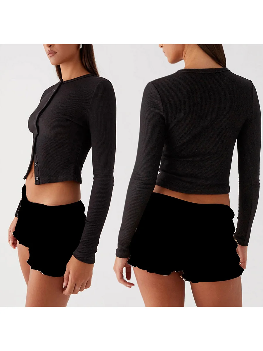 MQTIME  -  Women's Summer Y2K Basic Cropped Tops Ribbed Button-down Front Long Sleeve Simple Slim Fit Grunge T-Shirt Streetwear